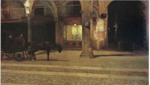 MANTOVA – C’è un quadro dipinto da Vindizio Nodari Pesenti nel 1900 che si intitola “Mantova di Notte” e che rappresenta una sorta di spartiacque. È l’immagine di una città sospesa, in bilico tra due epoche. «Questo dipinto ci dice: attenzione, sta arrivando la luce elettrica, ma la città è ancora illuminata dalle candele, dai lumi a petrolio, dal cosiddetto gas di città, che non era altro che lo spirito del carbone. È il grande momento del passaggio dalla Mantova città fortezza, città militare, vischiosa, umida e buia, a una città finalmente azzurra».