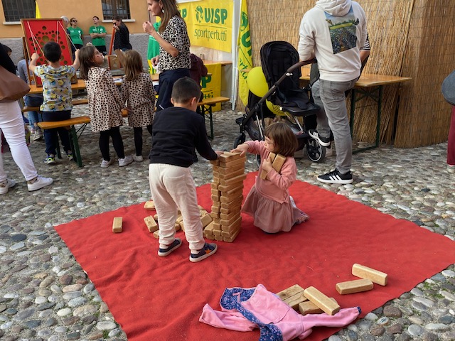 Sin dalle prime ore del pomeriggio, piazza Alberti si è riempita di visitatori incuriositi e di bambini entusiasti, che si sono cimentati con i giochi di un tempo, quelli semplici ma autentici, capaci di accendere la fantasia e regalare sorrisi genuini. C’è stato chi si è divertito a costruire piccole torri di legno solo per il gusto di farle crollare tutte insieme, chi si è sfidato concentrato nei giochi da tavolo, tra partite di dama e l’intramontabile Shangai in versione extralarge, e chi, brandendo una spada di legno, ha sognato di diventare cavaliere.