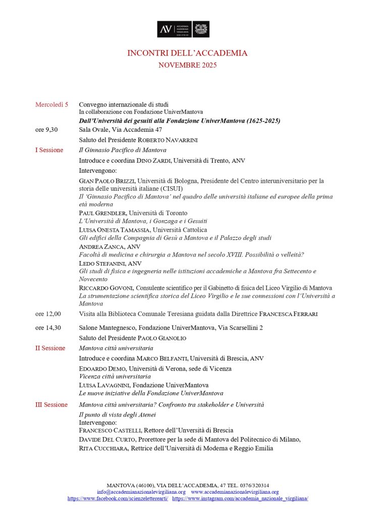 MANTOVA – Tutto pronto in Accademia Virgiliana per gli incontri in programma per il mese di novembre. Si parte mercoledì 5 alle 9.30 con il Convegno internazionale di studi in collaborazione con Fondazione UniverMantova dal titolo “Dall’Università dei gesuiti alla Fondazione UniverMantova (1625-2025)”. L’incontro nella Sala Ovale è diviso in tre sessioni. Alle 12.00 è prevista la visita alla Biblioteca Comunale Teresiana e alle 14,30 il convegno prosegue nel Salone Mantegnesco, Fondazione UniverMantova, Via Scarsellini 2.