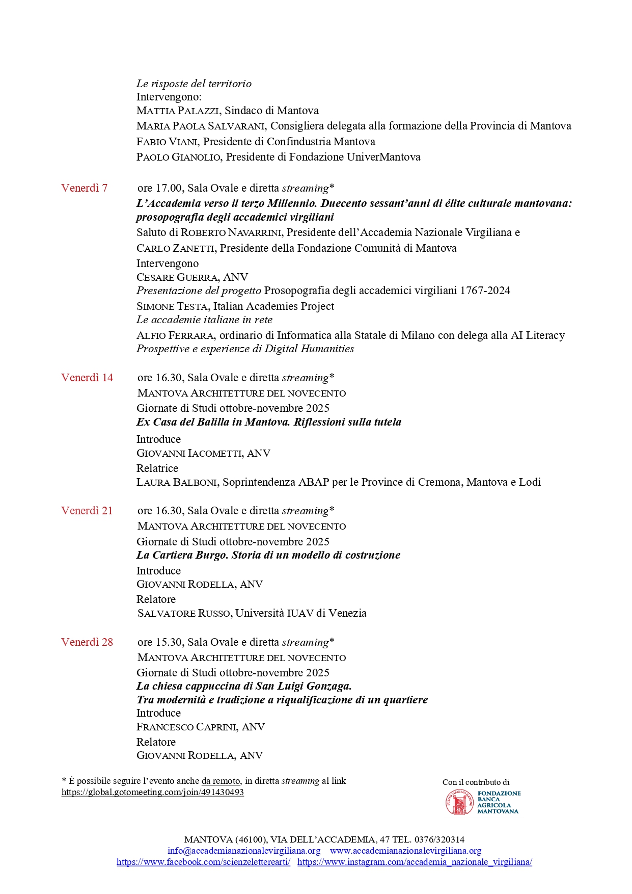 Venerdì 7 ore 17.00, Sala Ovale e diretta streaming* “L’Accademia verso il terzo Millennio. Duecento sessant’anni di élite culturale mantovana: prosopografia degli accademici virgiliani”.
