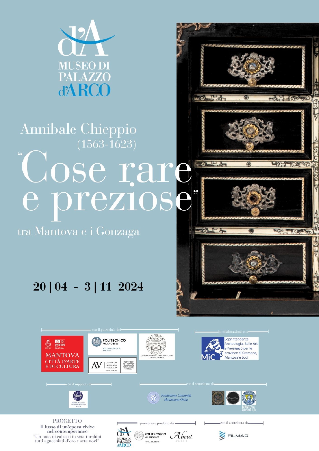 La mostra e il catalogo che l’accompagna cercano di ricostruire idealmente le dimore di Annibale e gli oggetti in esse contenuti. Magnifico scrigno di ‘cose rare e preziose’, pur non essendo quelle dove Annibale Chieppio visse, le stanze di Palazzo d’Arco hanno saputo però conservarne la memoria. La finalità della mostra è quella di rintracciare ciò che è rimasto, cercandolo tra le molte e belle cose oggi custodite in questa affascinante casa museo. Dipinti e manufatti, con il nucleo del tutto inedito di quelli devozionali e dei reliquiari, saranno esposti nelle sale di Palazzo d’Arco, convivendo con altre opere, testimoni di momenti diversi della sua storia. Nel loro insieme, vengono a costituire una nuova pagina da aggiungere al grande libro della storia di Mantova, negli anni ancora dominati dai Gonzaga, contribuendo alla mappa descrittiva del mondo delle cose, nel loro rapporto con chi le possedeva, rendendo più concreta l’identità del proprietario: il conte Annibale Chieppio.