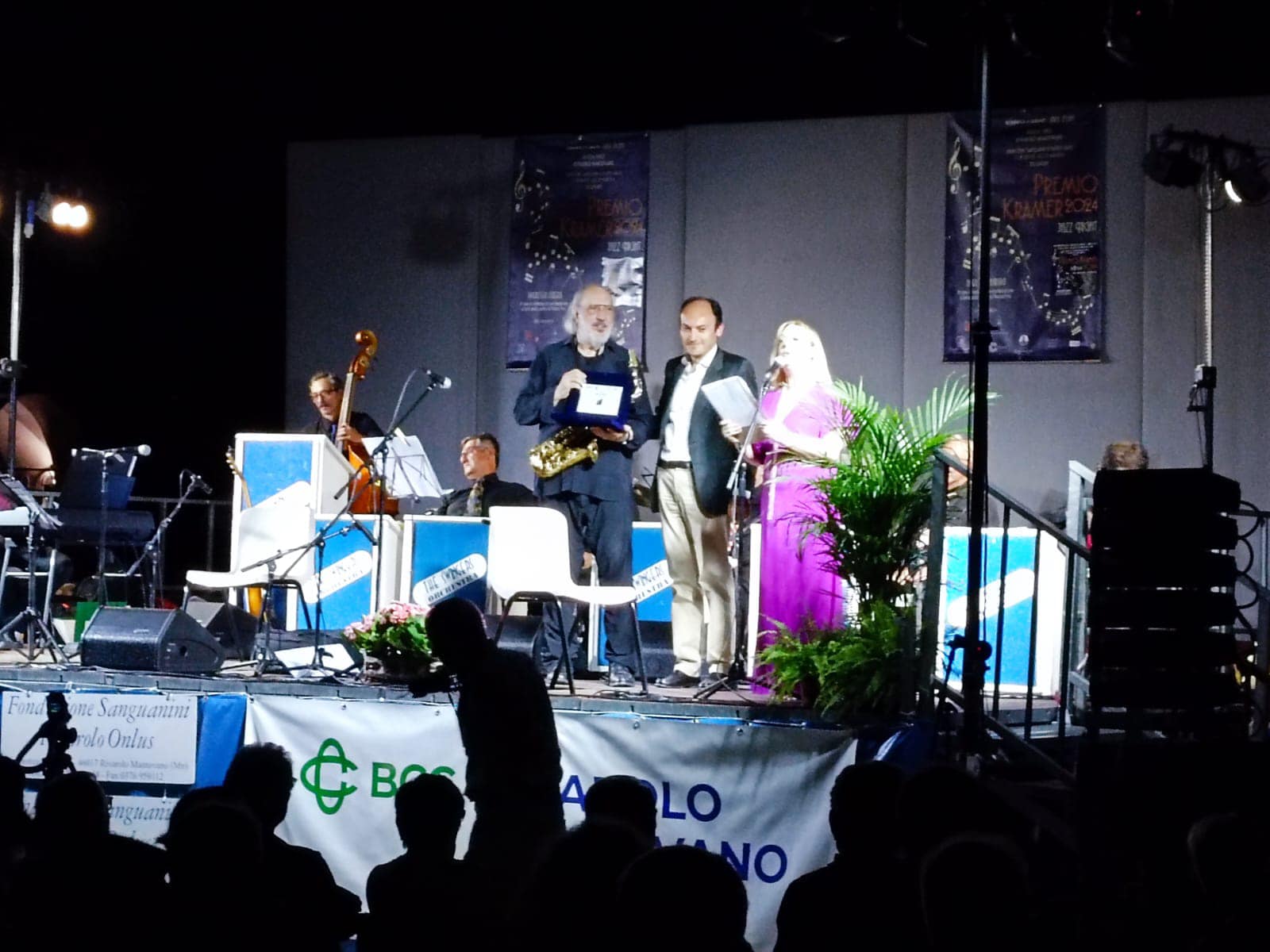 RIVAROLO MANTOVANO – Serata di grande jazz ieri sera a Rivarolo Mantovano in una piazza Finzi gremita in ogni ordine di posto, dove si è tenuta la serata del Premio Gorni Kramer. Il concerto della The Swingers Orchestra, con la sua magia, ha catturato l’attenzione degli oltre 400 presenti. Il complesso era composto da 11 elementi, tutti musicisti di grandissimo spessore: tra loro il vincitore di questa edizione. L’ambito riconoscimento, dedicato al grande compositore e direttore d’orchestra rivarolese, è stato infatti assegnato dalla Fondazione Sanguanini con il Circolo del Jazz di Mantova, a Gianluigi Trovesi, musicista bergamasco componente della celebre orchestra della Rai. A consegnare il premio il sindaco Massimiliano Galli e la dirigenza della Fondazione, guidata da Angelo Strina.