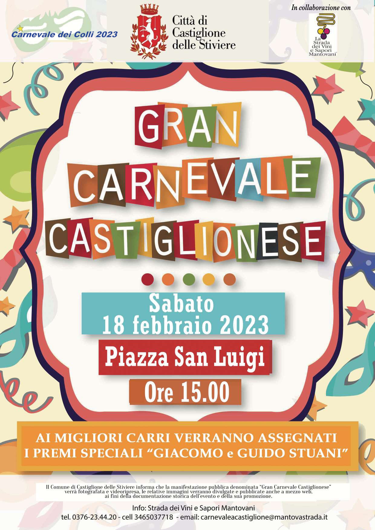 La manifestazione, con la sua lunga tradizione radicata nel territorio, è promossa dal Comune di Castiglione delle Stiviere in collaborazione con l’Associazione Strada dei Vini e Sapori Mantovani. Il “Gran Carnevale Castiglionese” rientra inoltre nel circuito del “Carnevale dei Colli”, al quale aderiscono altri comuni limitrofi e che prevede quest’anno una novità, ovvero l’assegnazione di un ulteriore premio: i carri ed il gruppo mascherato che totalizzeranno il maggior punteggio accumulato durante tutte le manifestazioni in calendario del Carnevale dei Colli riceveranno il Premio Fedeltà.