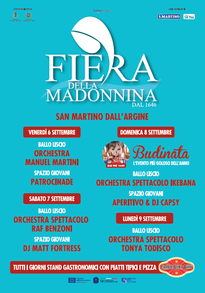 Domenica 8 sarà la giornata clou della Fiera, con tutto il paese chiuso al traffico, lo stand del cotechino al mattino, il tradizionale mercato domenicale, le giostre, i negozi aperti, il Mercatino del Riuso, la pesca di beneficenza, gli espositori, l’expo di auto e moto ecc. In mattinata gara di pesca presso l’Oasi Margonare e Santa Messa in onore appunto della Madonnina. Durante il pomeriggio, l’evento più goloso dell’anno: la Budinata. Non mancherà lo stand della ditta CLECA dove si potranno acquistare i tantissimi prodotti dell’azienda. La sera, ballo liscio con l’Orchestra “Ikebana” e Spazio Giovani con aperitivo e musica di dj Capsy.