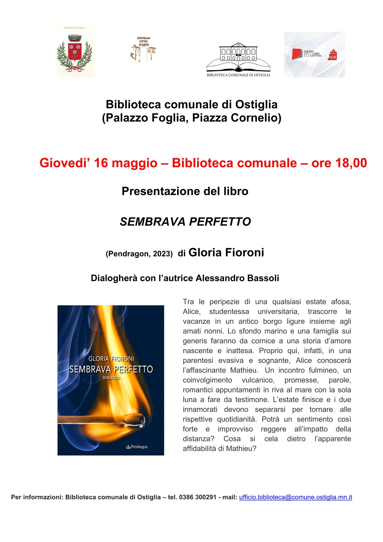 OSTIGLIA – Si intitola “Sembrava perfetto” (ed. Pendragon, 2023) il libro di Gloria Fioroni che sarà presentato giovedì 16 maggio alla Biblioteca comunale di Ostiglia alle ore 18. Dialogherà con l’autrice Alessandro Bassoli.