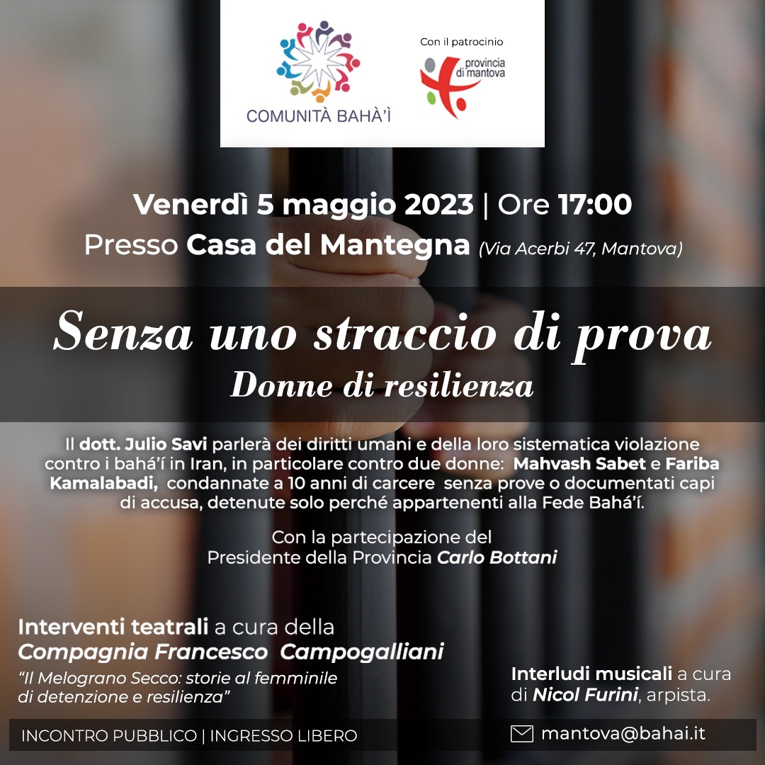 MANTOVA – “Senza uno straccio di prova. Donne di resilienza”. Questo il titolo dell’evento che si terrà venerdì 5 maggio 2023, ore 17.00 presso la Casa del Mantegna, in Via Acerbi 47. L’iniziativa, aperta a tutta la cittadinanza, è stata promossa galla Comunità Bahá’í con il patrocinio della Provincia di Mantova.