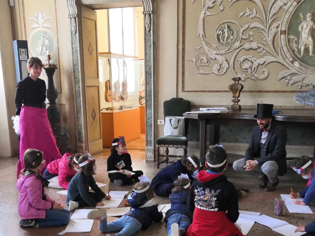 Proprio dalla sala della musica il note degli Aristogatti suonato con il violino da una bimba, ha accompagnato i piccoli ospiti alla ricerca della sala degli antenati, seconda tappa del pomeriggio, e qui i bimbi hanno disegnato l’arte legata alla musica.