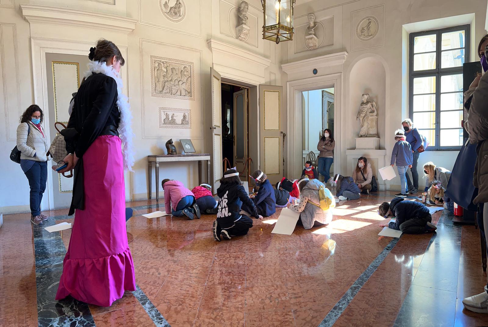 Poi tramite una caccia al tesoro con indovinelli si è giunti alla tappa numero tre: la saletta neoclassica e qui, protagonista è stata l’arte della scultura. Nuova tappa e nuovo disegno fino all’indovinello del gatto Matisse, il gatto pittore, che ha condotto i piccoli nella sala più colorata e allegra del palazzo, la sala dello zodiaco, la quarta tappa del viaggio. E qui la protagonista non poteva che essere lei, l’arte della pittura. Dopo l’ultimo disegno la giornata si è conclusa con un augurio “Che i bimbi presenti, come gli Aristogatti, potessero divertirsi con la loro arte preferita”.
