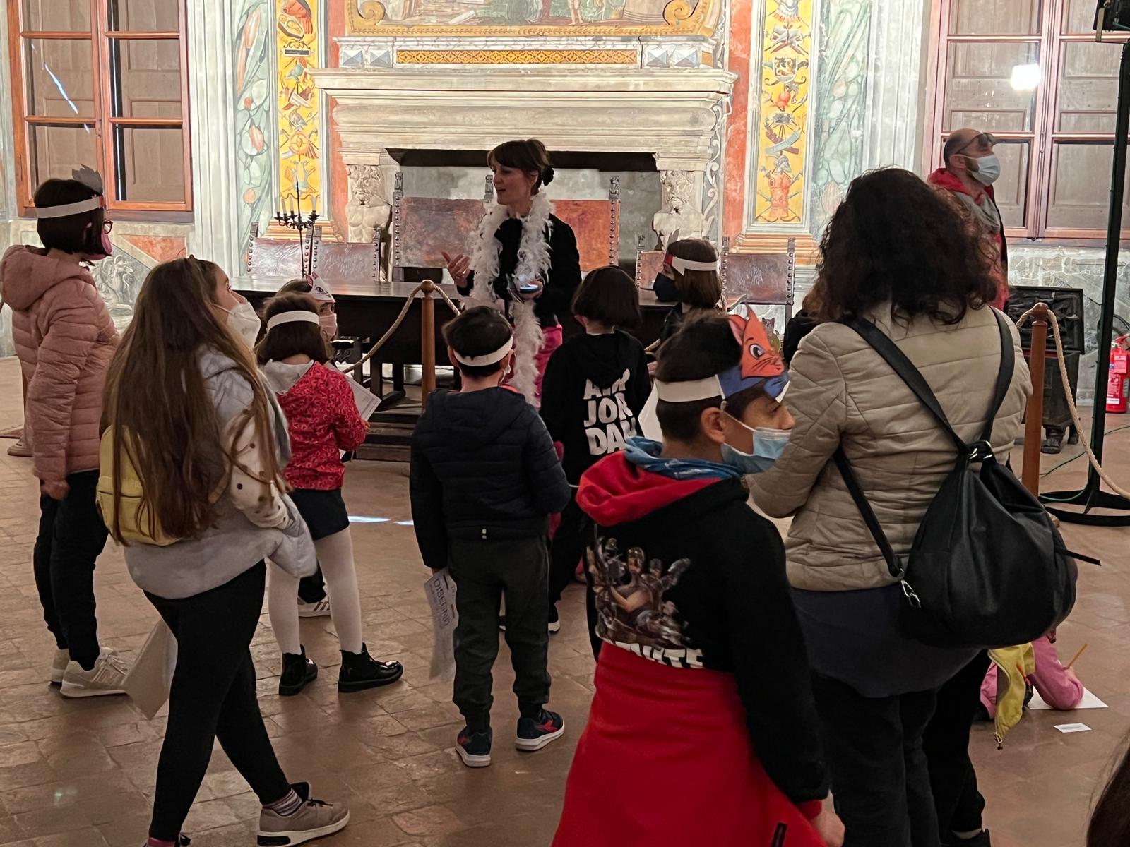 Quattro le tappe: all’ingresso il maggiordomo Edgar ha accolto i bimbi vicino alla carrozza e ha consegnato loro una coroncina con il muso di Bizet, Matisse e Minù, poi la prima tappa nella sala della musica, dove la contessa Adelaide ha accolto i bimbi ascoltando la Carmen di Bizet e ha raccontato loro chi sono gli “aristocratici” in un paragone tra le figure dei cartoni e i membri della famiglia d’Arco.