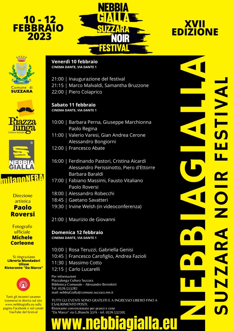 SUZZARA – Dal 10 al 12 febbraio 2023 torna in presenza il “NebbiaGialla Suzzara Noir Festival”, festival internazionale del giallo e del noir giunto alla sua 17°edizione, dedicato alla letteratura di genere, ed è diventato negli anni un punto di riferimento per gli scrittori e per un pubblico sempre più numeroso.
