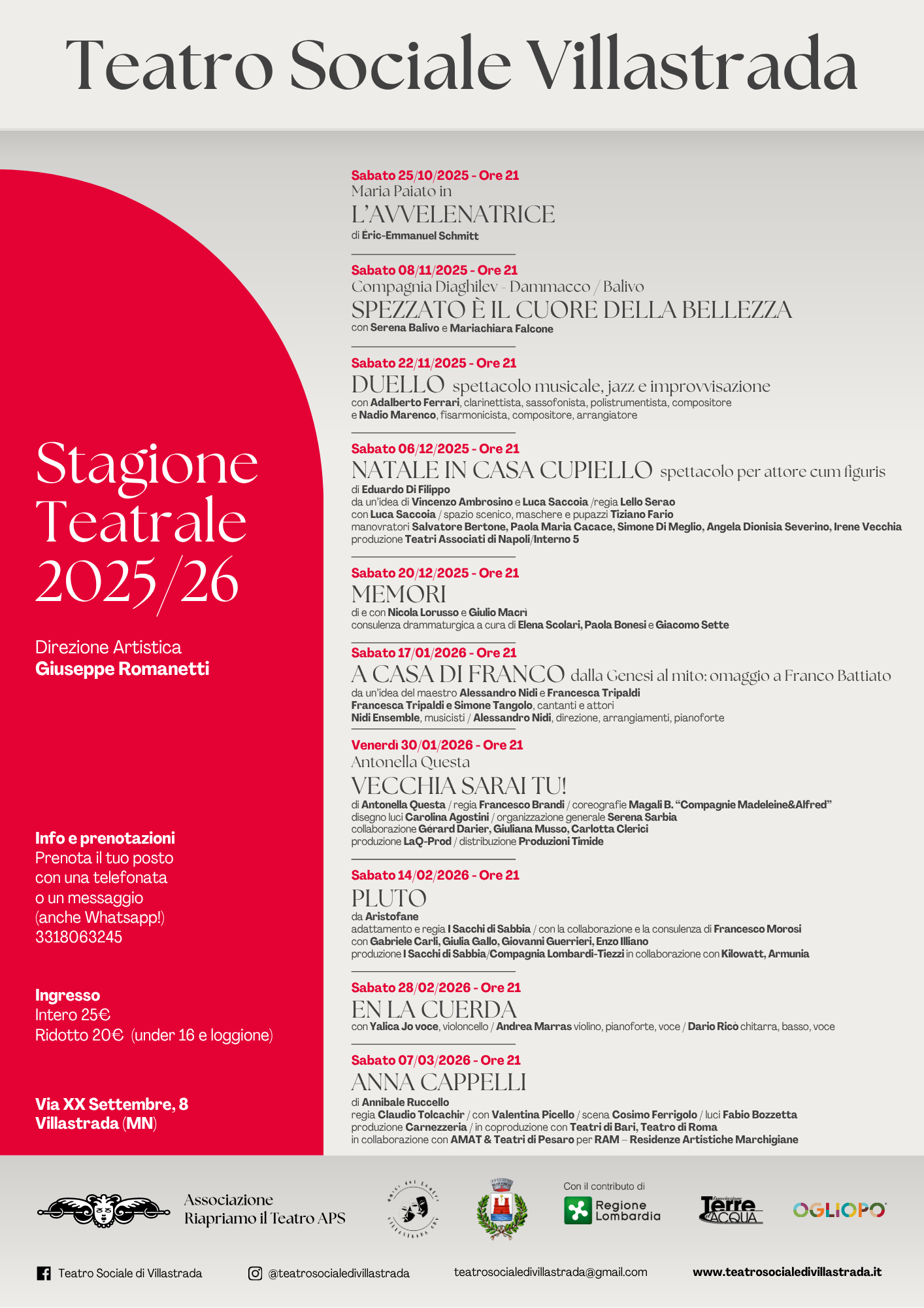 La rassegna è patrocinata dal Comune di Dosolo, realizzata nell’ambito del Festival Terre d’Acqua 2025-2026 con il contributo di Regione Lombardia. Una stagione promossa da Associazione Riapriamo il Teatro APS con il determinante supporto di Amici del Teatro di Villastrada. La direzione artistica è affidata a Giuseppe Romanetti.
