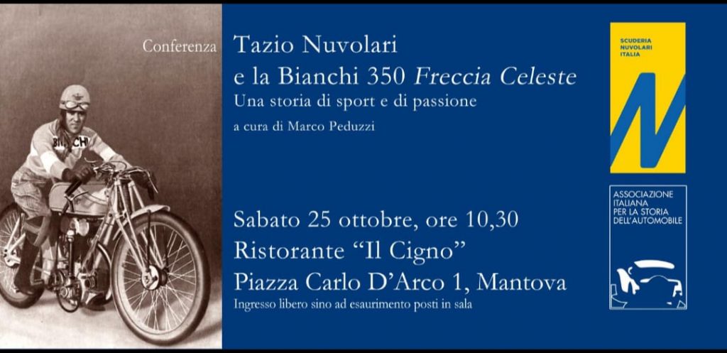 MANTOVA – “Tazio Nuvolari e a Bianchi Freccia Celeste. Una storia di sport e passione” è il tema della conferenza organizzata da Scuderia Nuvolari Italia e Associazione italiana per la storia dell’automobile sabato 25 ottobre alle 10.30 al ristorante Il Cigno di Mantova, in piazza D’Arco.