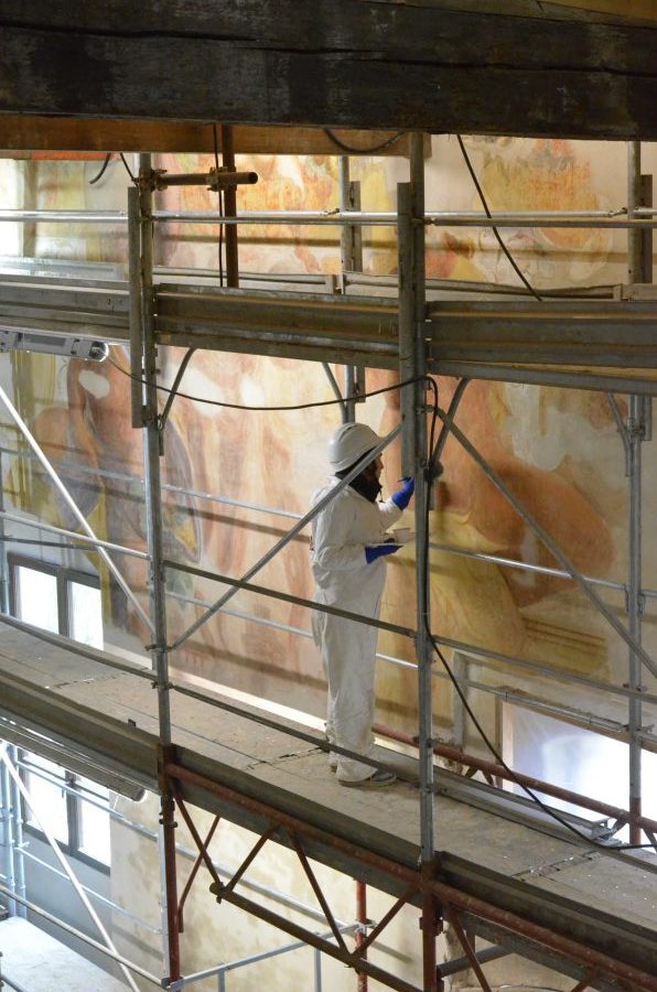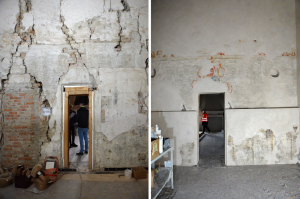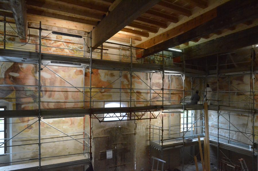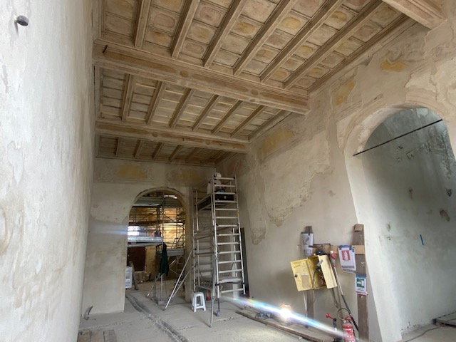 «Stanno terminando i restauri degli apparati decorativi. Per il momento ci stiamo concentrando al piano terra, poi, quando saranno fatti i getti per i pavimenti e le altre lavorazioni, noi restauratori ci sposteremo nuovamente al piano superiore, dove restano da ultimare solo un paio di stanze».