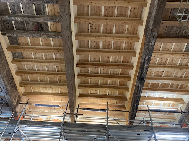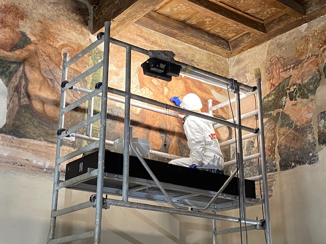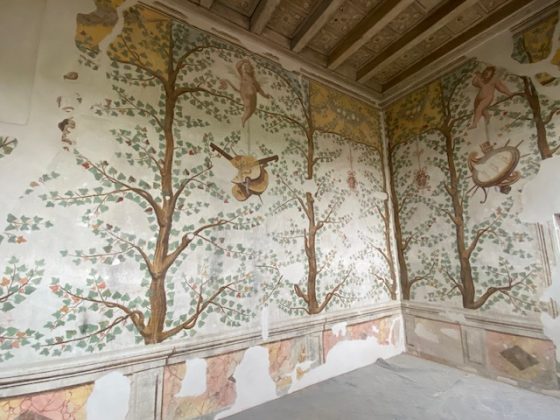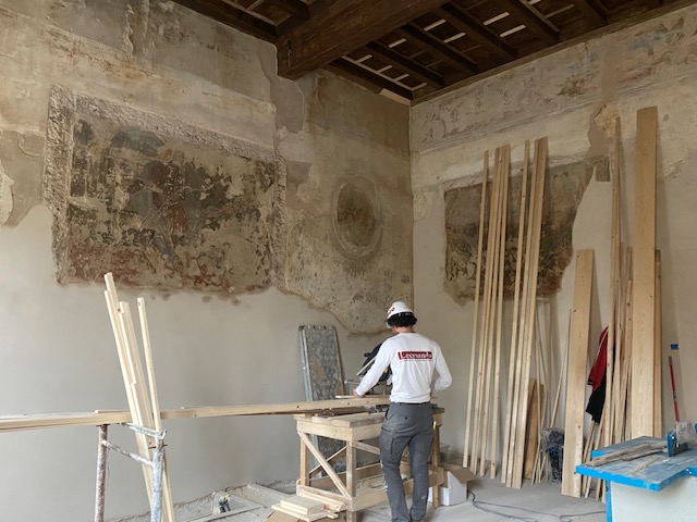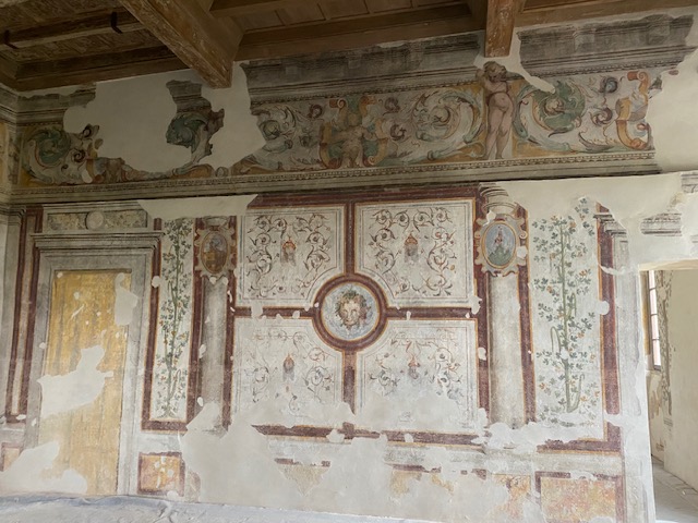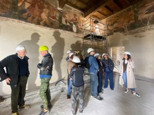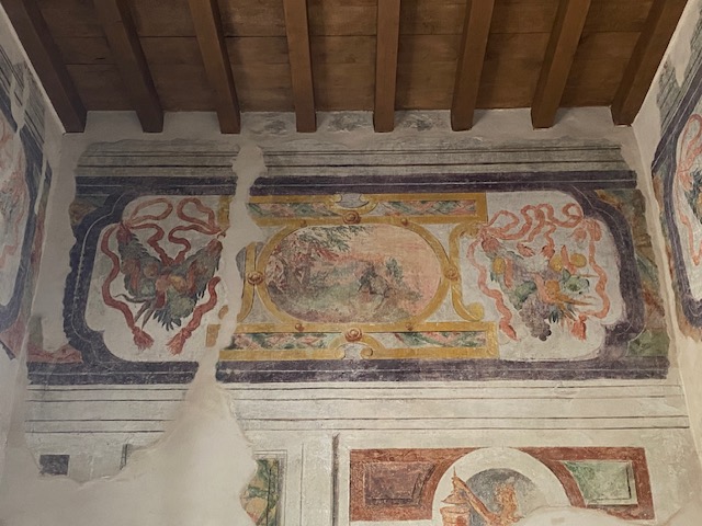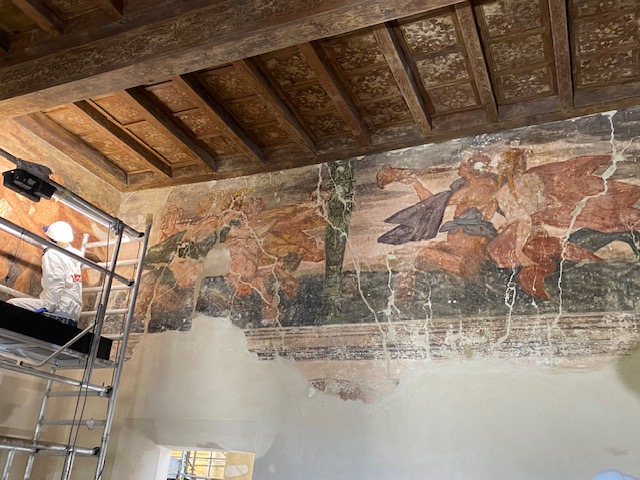 Il cantiere ha restituito anche importanti sorprese dal punto di vista storico. Tra le scoperte più significative emerge una parete affrescata che in origine era esterna : un indizio prezioso che riconduce al primo nucleo quattrocentesco dell’edificio, probabilmente sviluppato in altezza come una casa torre.