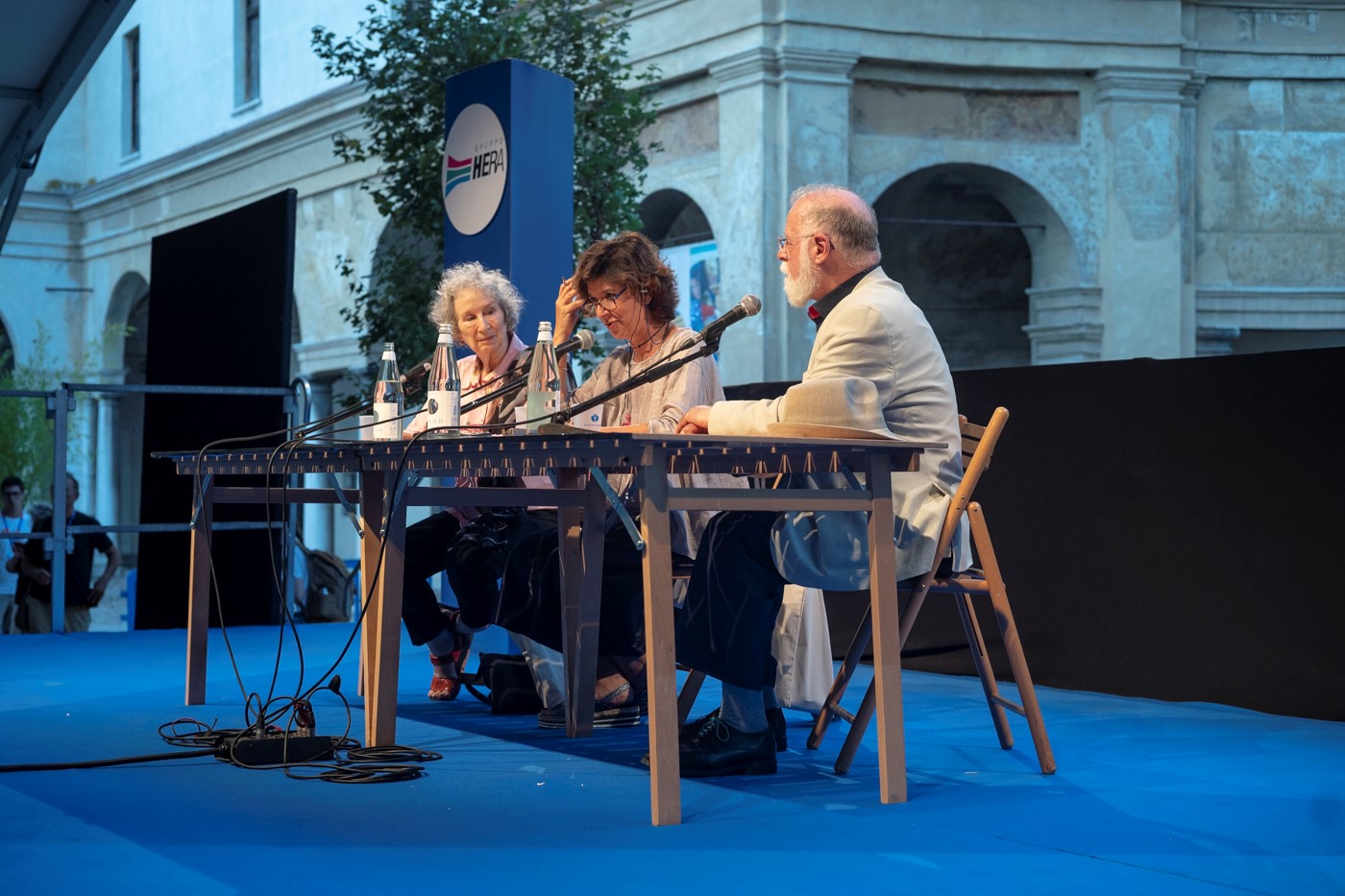Mantova – Un’affollata piazza Castello accoglie la scrittrice canadese Margaret Atwood, accompagnata dallo scrittore-critico-lettore e amico Alberto Manguel.