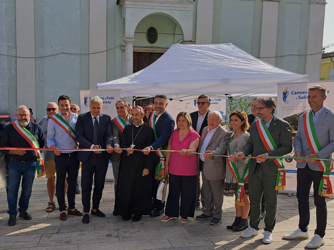 Ma oggi è stato soprattutto il giorno dell’inaugurazione ufficiale del Cammino di Fede e Solidarietà, 175 km di sentieristica nel territorio tra le province di Mantova e Brescia, sulle tracce di vita di tre grandi Santi: San Luigi Gonzaga a Castiglione delle Stiviere, Beata Paola Montaldi a Volta Mantovana e Sant’Angela Merici a Desenzano del Garda. L’itinerario, promosso dall’Associazione Colline Moreniche del Garda che compie 35 anni, ha visto il momento del taglio del nastro davanti alla basilica di San Luigi con il vescovo Marco Busca affiancato dai sindaci degli undici comuni che rientrano nel percorso, dal consigliere regionale Alessandra Cappellari e da Gastone Savio, l’ex parlamentare di Solferino che ha ideato il progetto dell’itinerario, liberamente ispirato al Cammino di Santiago, anche se ovviamente in forma più ristretta. Nel caso del Cammino di Fede e Solidarietà il carattere religioso, che è l’elemento prioritario, si arricchisce con le bellezze paesaggistiche e naturalistiche delle colline moreniche e con i suoi tanti riferimenti storico-culturali. Proprio “la solidarietà” è legata alla Croce Rossa la cui idea nacque a Castiglione con Henry Dunant a seguito della sanguinosa battaglia di Solferino e San Martino nel 1859.