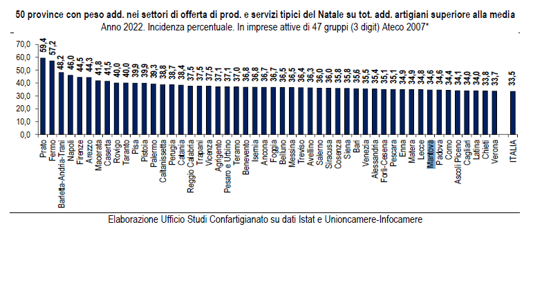 In provincia di Mantova, la spesa a dicembre in prodotti alimentari, bevande e altri prodotti e servizi tipici del Natale ammonta a circa 176 milioni di euro. La nostra provincia conta 2.614 imprese per un totale di 8.273 addetti nei settori di offerta di prodotti tipici natalizi. Questi numeri collocano il territorio virgiliano tra i primi cinquanta con il peso più rilevante dell’artigianato interessato dalla domanda per le festività.
