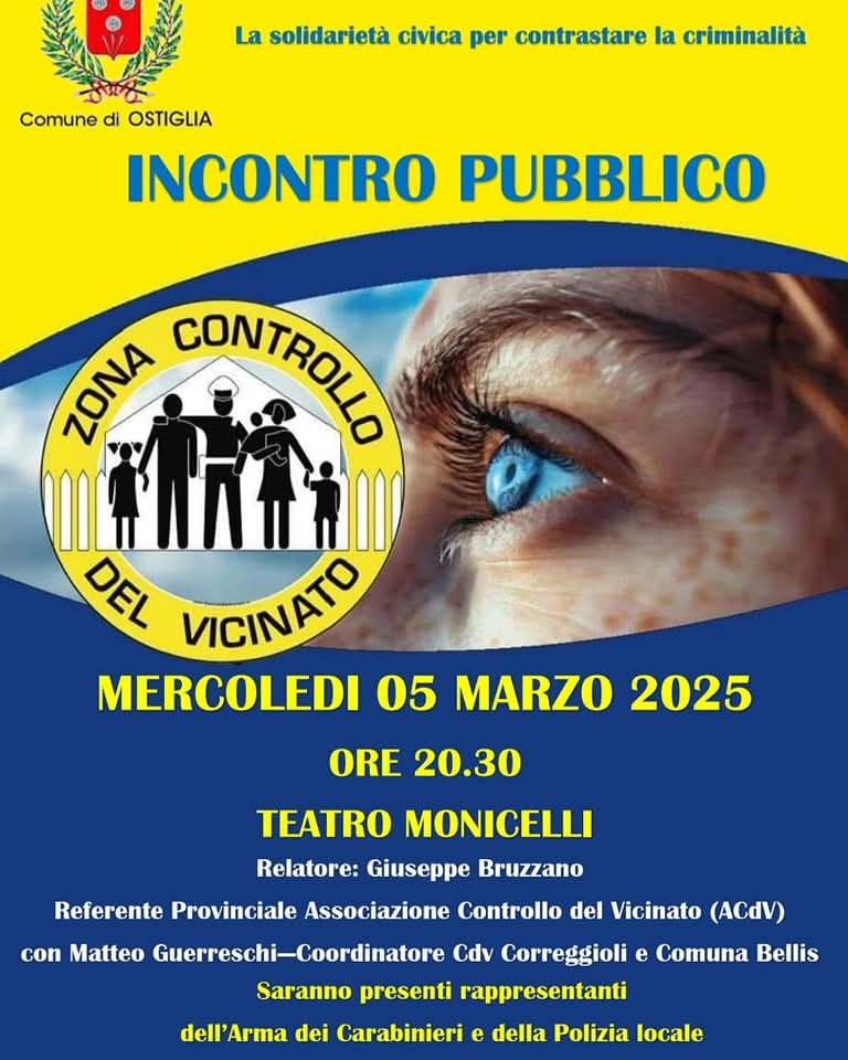 OSTIGLIA – Mercoledì 5 marzo alle ore 20.30 il Teatro Monicelli ospiterà l’incontro pubblico promosso dal Comune di Ostiglia sul Controllo del Vicinato. Relatore della serata sarà Giuseppe Bruzzano, referente provinciale dell’associazione Controllo del Vicinato (ACdV) con Matteo Guerreschi (coordinatore Cdv Correggioli e Comune Bellis). Saranno presenti in sala rappresentanti dell’Arma dei Carabinieri e della Polizia Locale.