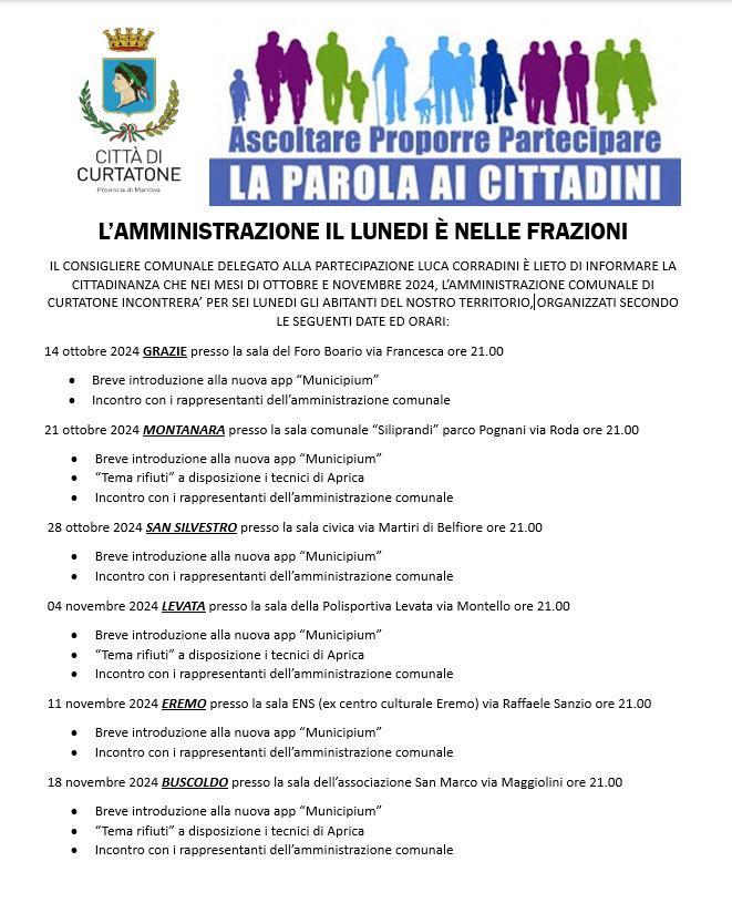 Gli incontri si configurano come un’occasione per i residenti di esporre richieste, segnalare eventuali criticità, chiedere consigli o indicazioni utili. “In tre occasioni – continua Corradini – ovvero Levata, Montanara e Buscoldo, saranno presenti anche i tecnici di Aprica che daranno informazioni sul servizio e forniranno eventuali chiarimenti sulla raccolta dei rifiuti”.