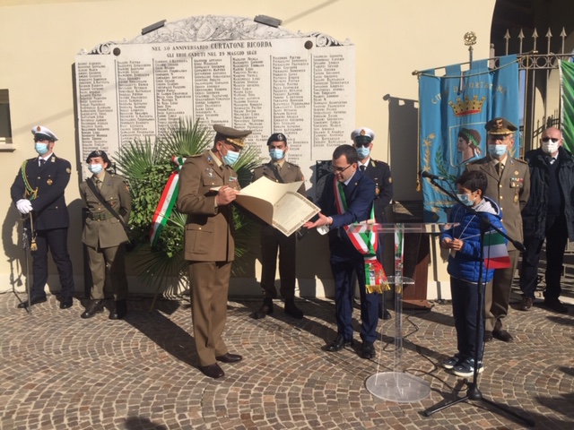 A tal proposito, durante la cerimonia, a cui a fianco del sindaco Carlo Bottani sono intervenuti il colonnello Luigi Tufano, comandante del 4° Reggimento artiglieria controaerei “Peschiera”, il generale del Bersaglieri Raffaele De Feo, e i rappresentanti provinciali e locali delle forze di polizia, dopo l’alzabandiera, l’onore ai caduti e la preghiera del parroco don Cristian Grandelli, è stata scoperta una lapide posta sulla facciata del municipio a ricordo del conferimento da parte del Comune di Curtatone della cittadinanza onoraria al Milite ignoto.