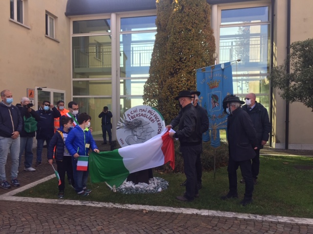 E’ stato quindi il momento dell’orazione commemorativa da parte del generale De Feo a cui è seguita l’inaugurazione, sempre nel cortile del Municipio, del cippo ai caduti donato dai bersaglieri, anche in questo caso scoperto dal sindaco Bottani, insieme a due alunni, e all’assessore Luigi Gelati, pure lui bersagliere in gioventù a cui sono andati i ringraziamenti per il suo impegno svolto in questa particolare occasione. Ultimo atto della cerimonia la foto di rito con le autorità e tutti i labari delle sezioni mantovane dell’Associazione Nazionale Bersaglieri.