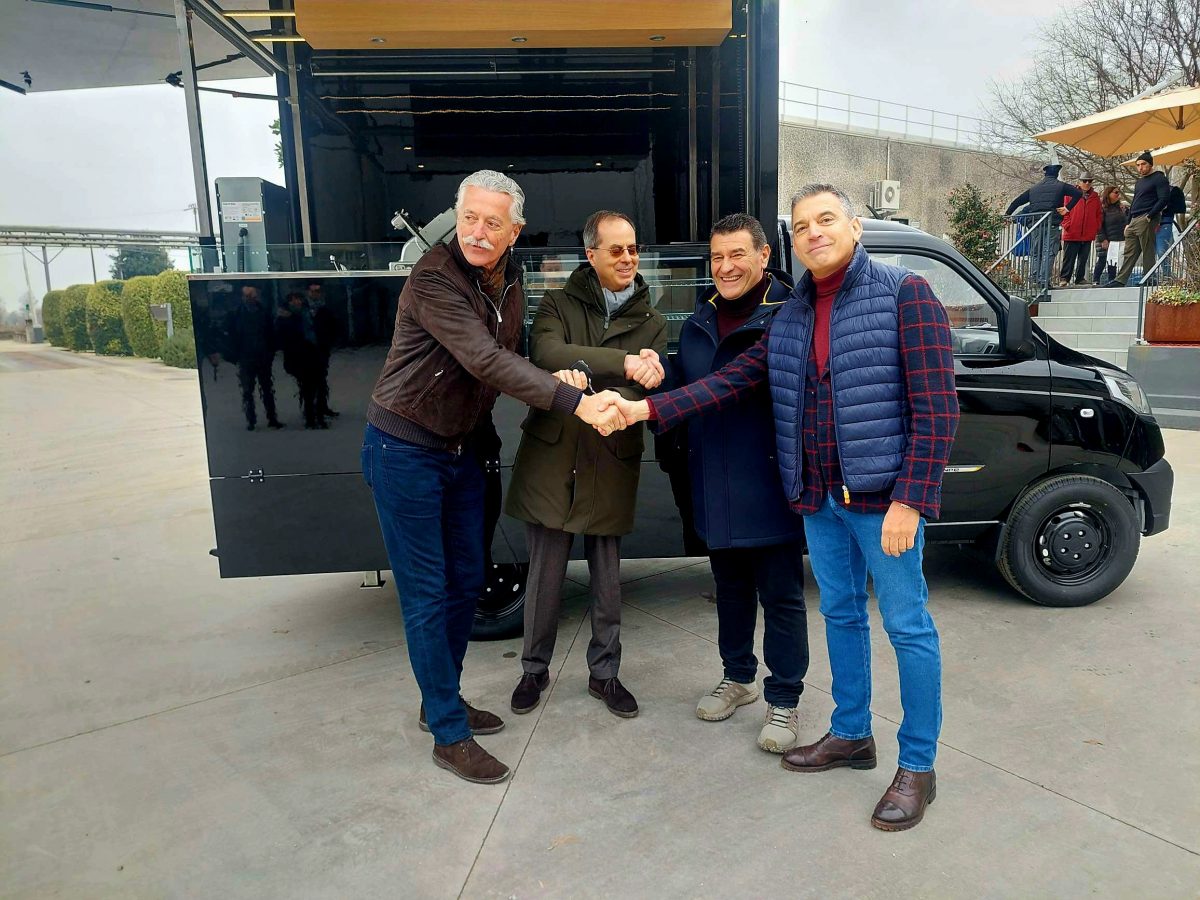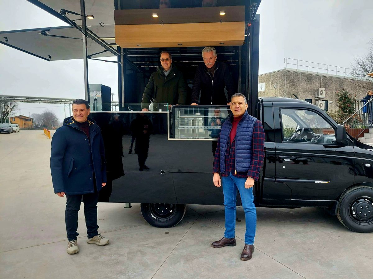 CERLONGO (GOITO) – Hanno deciso di chiamarlo DOP On The Road, e in effetti di strada è destinato a farne tanta: la prima tappa saranno nientemeno le Alpi che ospiteranno le Olimpiadi invernali di Cortina Milano 2026. Il nuovissimo food truck marcato Piaggio – di fatto un Porter opportunamente allestito e a trazione elettrica – è stato presentato questa mattina alla Latteria San Pietro a Cerlongo dal Presidente e dal Consigliere d’Amministrazione di Piaggio Matteo Colaninno e Carlo Zanetti, dal Presidente della Cooperativa San Pietro Stefano Pezzini e dal Presidente di Cooperativa Effeciesse Mario Delporto.