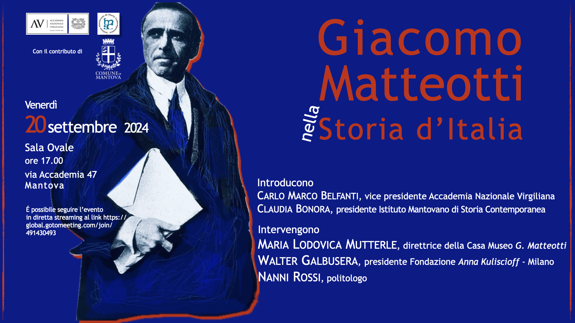 MANTOVA – “Giacomo Matteotti nella storia” è il titolo dell’incontro aperto al pubblico che si terrà venerdì 20 settembre nella Sala Ovale di via Accademia 47, organizzato da Accademia Nazionale Virgiliana e Istituto Mantovano di Storia Contemporanea con il contributo del Comune di Mantova.