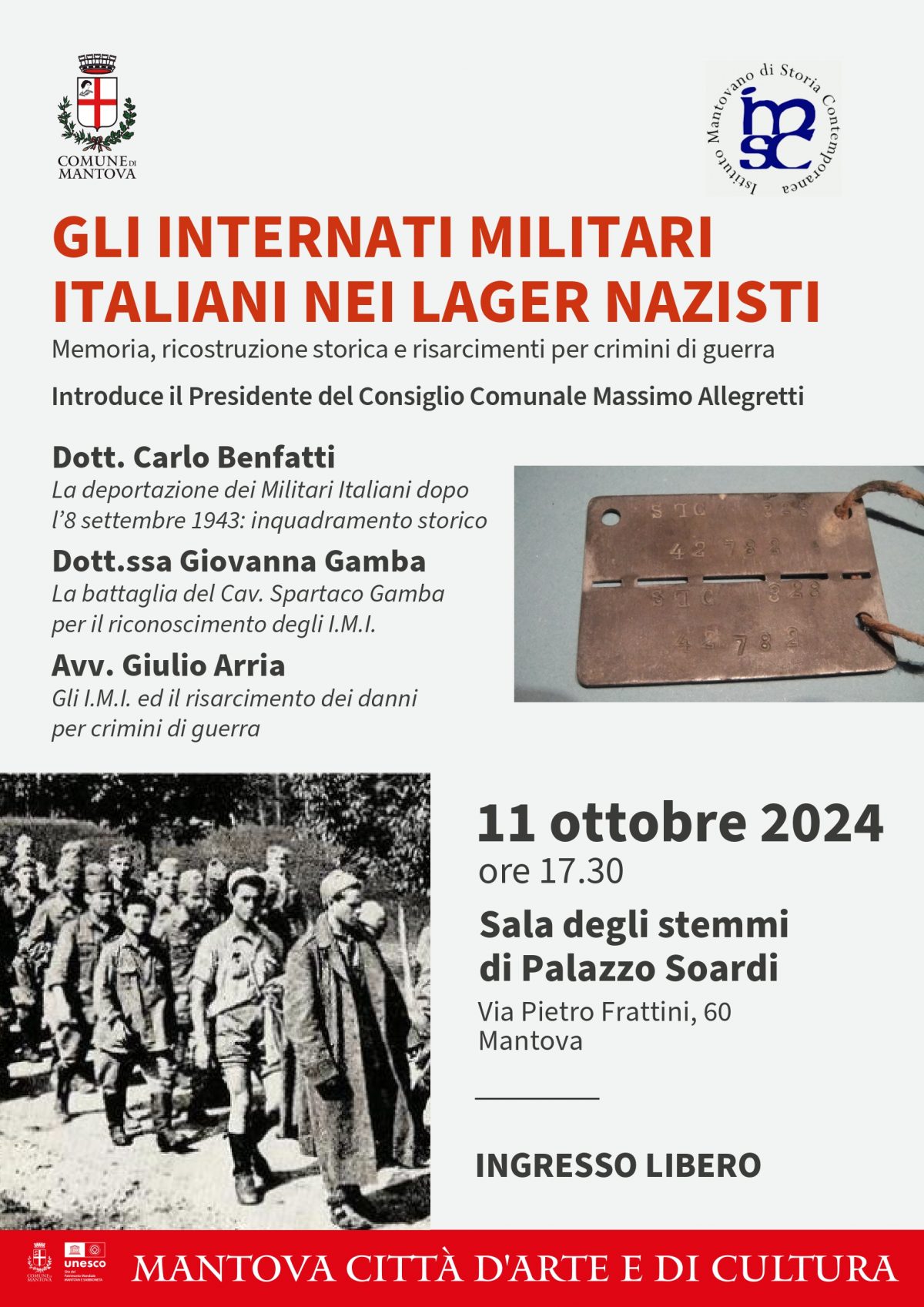 MANTOVA – Si intitola “Gli internati militari italiani nei lager nazisti – Memoria, ricostruzione storica e risarcimenti per crimini di guerra” il convegno che venerdì 11 ottobre, alle ore 17.30, si terrà nella sala degli Stemmi di Palazzo Soardi (via Pietro Frattini 60).