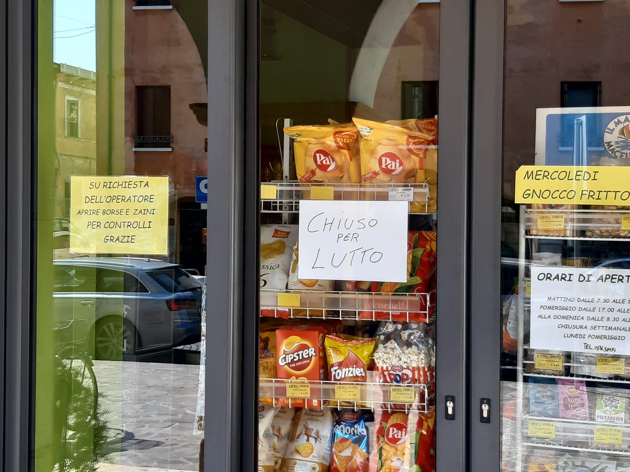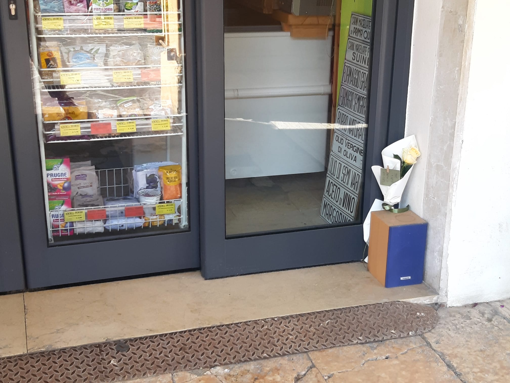 Davanti alla serranda abbassata del negozio, chiuso per lutto, alcuni cittadini hanno lasciato piccoli omaggi floreali in segno di affetto e riconoscenza.