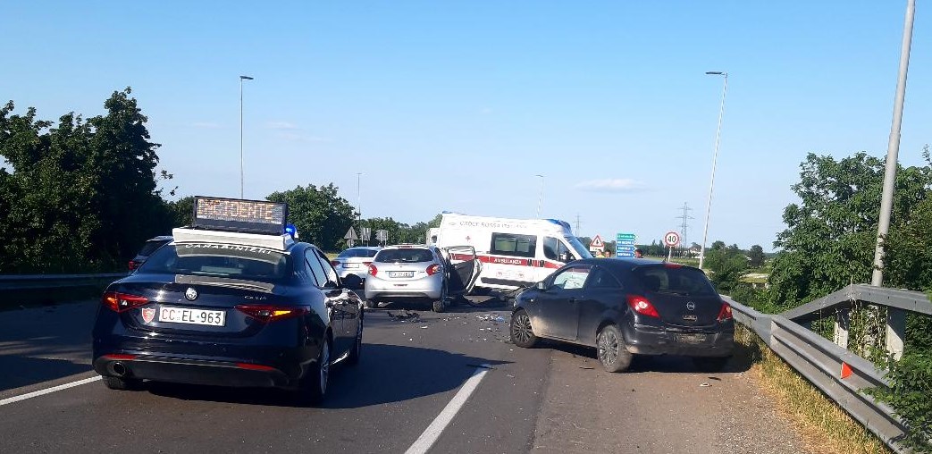 GUASTALLA (REGGIO EMILIA) – Tragedia sfiorata nel tardo pomeriggio di oggi, poco dopo le 18, sulla Variante Cispadana, all’altezza dello svincolo per San Giacomo, dove un violento schianto frontale ha coinvolto due vetture: una Peugeot 208, con a bordo quattro uomini di origine straniera, e un’Opel Astra guidata da una 40enne residente nel Mantovano. Secondo le prime ricostruzioni, l’incidente sarebbe stato causato da una manovra errata, con una delle due auto che avrebbe imboccato il raccordo contromano, trovandosi frontalmente l’altra vettura. La dinamica dello schianto è ancora in fase di accertamento da parte dei Carabinieri di Boretto, intervenuti per i rilievi di legge.