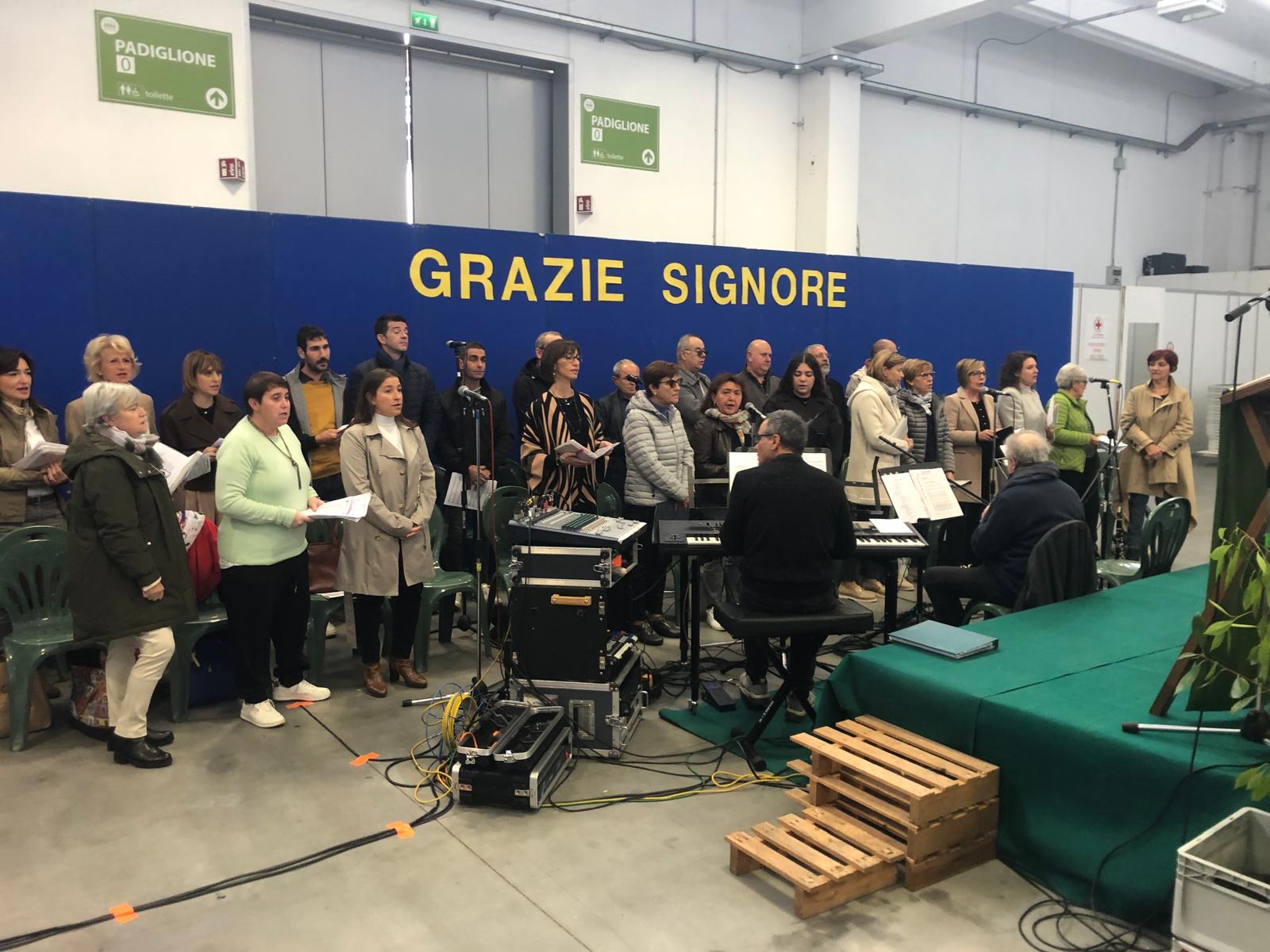 Il coro è stato diretto dal Maestro Renato Giorgi. Dietro l’altare la scritta “Grazie Signore”. Alla messa hanno partecipato circa 400 persone. Al termine, in un altro padiglione, è stato allestito un banchetto con la partecipazione di circa 200 commensali.