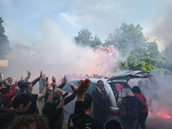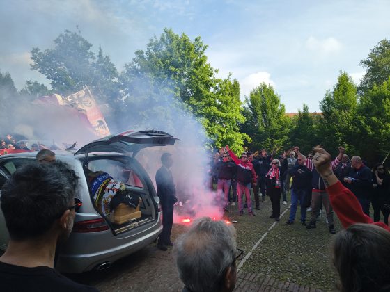 C’è infatti chi viene da molto lontano, dalla Calabria o dalla Francia, per dire addio a Massimiliano Sacchieri. E poi c’è la sua curva, il suo quartiere, Valletta Valsecchi, che si raduna dentro e fuori il Gradaro. Anche il sindaco Mattia Palazzi si confonde nella folla composta da alcune centinaia di persone: col “Macia”, ricorda, ci parlava praticamente ogni mattina, al bar o per le strade in cui entrambi abitavano. La mattina per molti è cominciata fuori dallo stadio “Martelli”, che dista alcune decine di metri: sugli spalti, in corrispondenza della curva, è stato srotolato lo striscione “Macia è qua”. Altri sono andati a fare visita alla casa funeraria a Levata.
