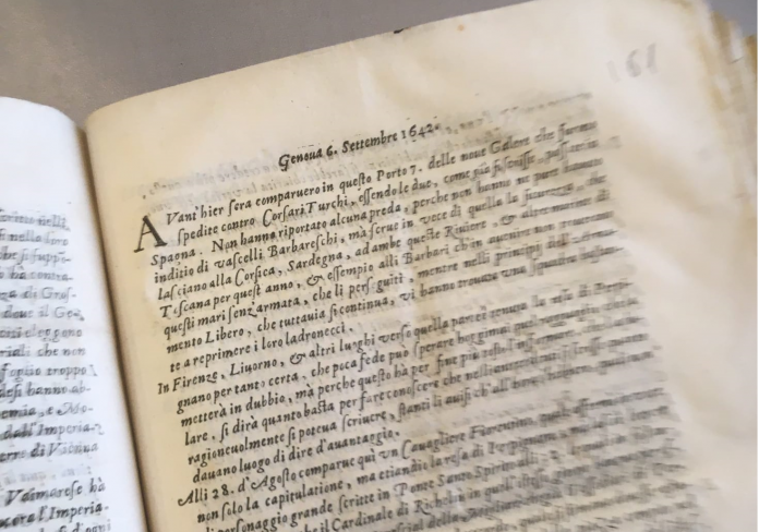 Nel numero più antico, del 29 luglio 1639, si legge tra l’altro: “Fu hieri dal Maggior Consiglio creato Duce di questa Serenissima Repubblica il serenissimo signor Giovanni Battista Durazzo, personaggio in cui oltre all’essere già il terzo della sua famiglia concorrono tutte le virtù principesche come pietà, prudenza, giustitia, vigilanza…”- Nel 1642, 30 agosto, si parla dei Gonzaga: “La settimana passata s’avanzò il marchese di Bagnasco con un nervo di gente francese nelle Langhe di cui doppo qualche contrasto s’impadronì delle terre di Bisagno, obbligando quelli difensori a ritirarsi nel castello, del quale non li riuscì l’acquisto, perché fu sopraggiunto Vincenzo Gonzaga con 800 cavalli e circa mille fanti lo necessitò a ritirarsi….”. Il protagonista è Vincenzo Gonzaga (1605-1694) del ramo cadetto di Guastalla, figlio di Ferrante II Gonzaga, avventuriero e uomo di guerra. Fu anche viceré e consigliere del governatore di Milano. Poco prima di morire a Salamanca si fece frate.