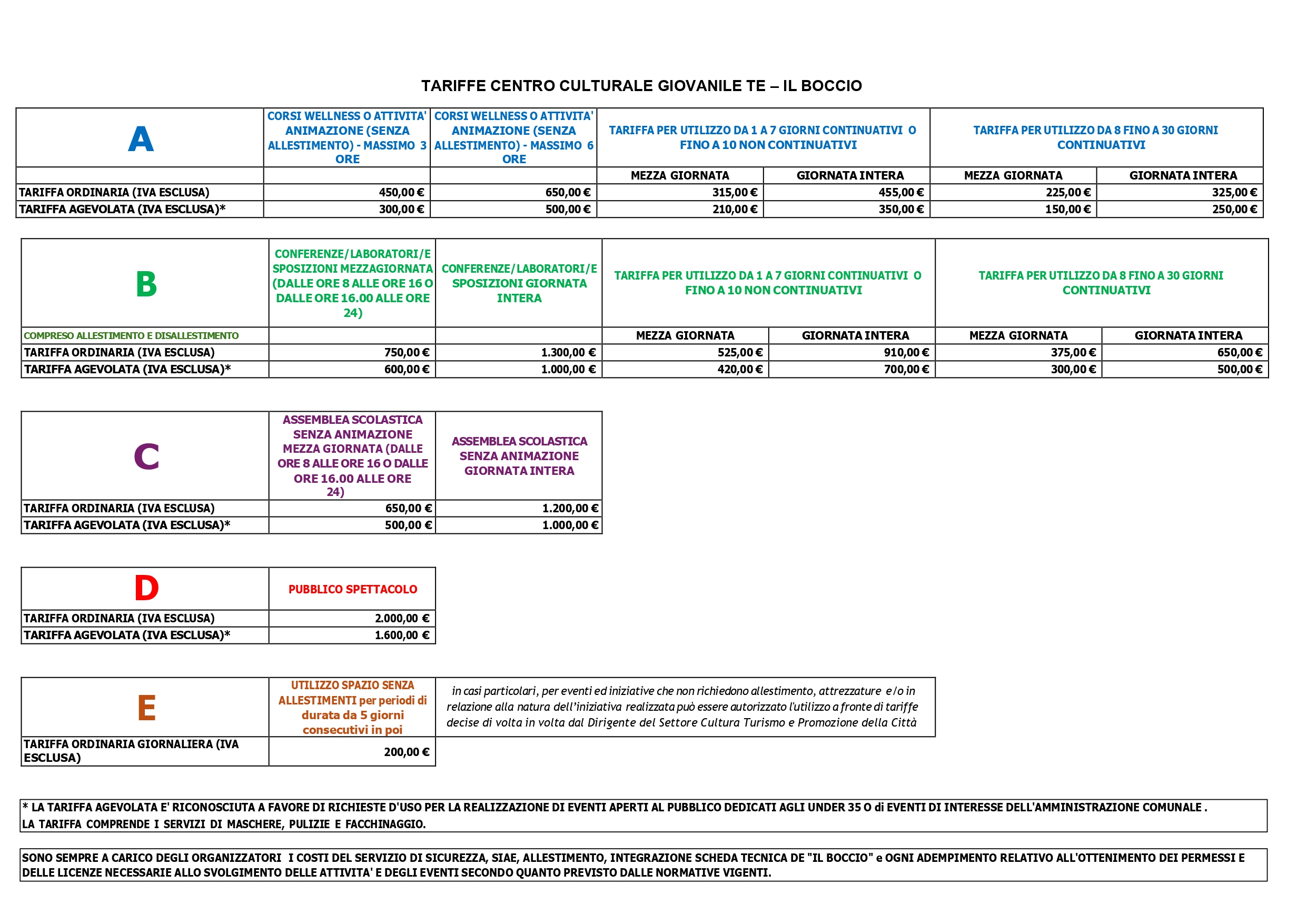 Restano sempre a carico degli organizzatori i costi del servizio di sicurezza, Siae, allestimento, integrazione scheda tecnica de “Il Boccio” e ogni adempimento relativo all’ottenimento dei permessi e delle licenze necessarie allo svolgimento delle attività e degli eventi secondo quanto previsto dalle normative vigenti.