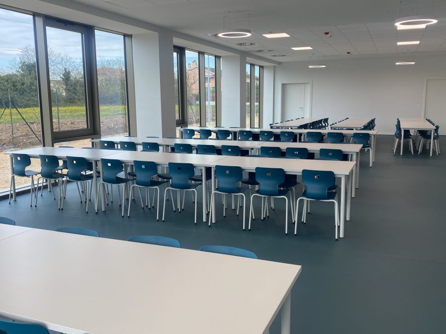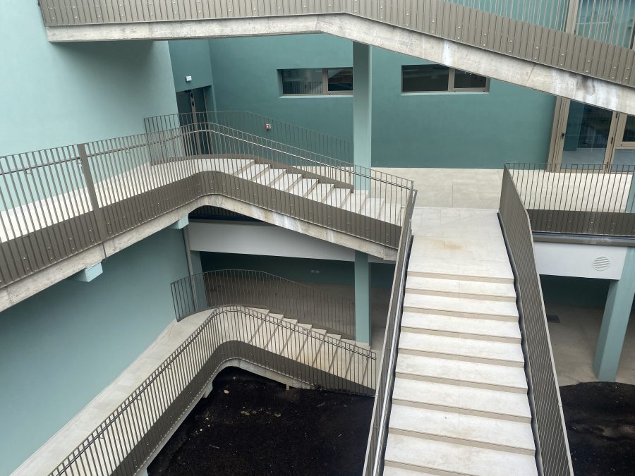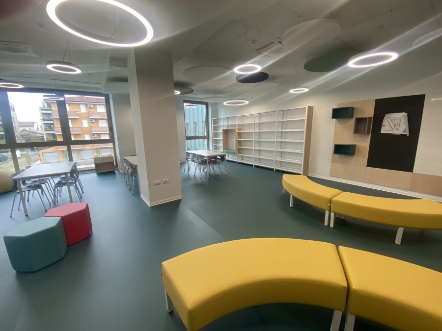 L’edificio è stato progettato come una scuola contemporanea e aperta, organizzata in tre sezioni didattiche e dotata di spazi innovativi: laboratori, biblioteca, mensa con cucina, auditorium, oltre a spazi interni ed esterni pensati per la didattica e la relazione, come il giardino e la terrazza per l’outdoor education.
