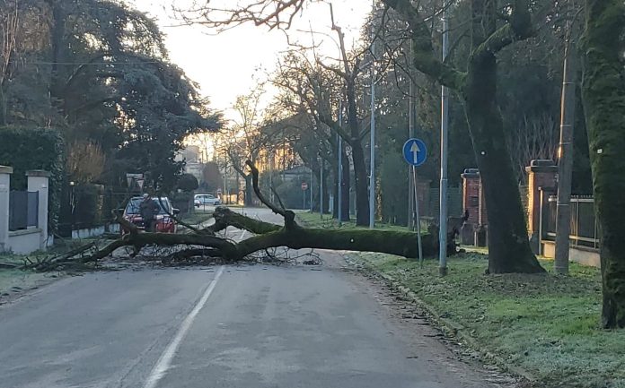 PEGOGNAGA – Paura questa mattina in via Marconi, dove poco dopo le 8.30 un tiglio di grandi dimensioni è improvvisamente crollato sulla carreggiata. L’albero, probabilmente indebolito alla base e messo ulteriormente sotto stress dal vento forte e dalla pioggia degli ultimi giorni, è caduto occupando tutta la larghezza della strada.