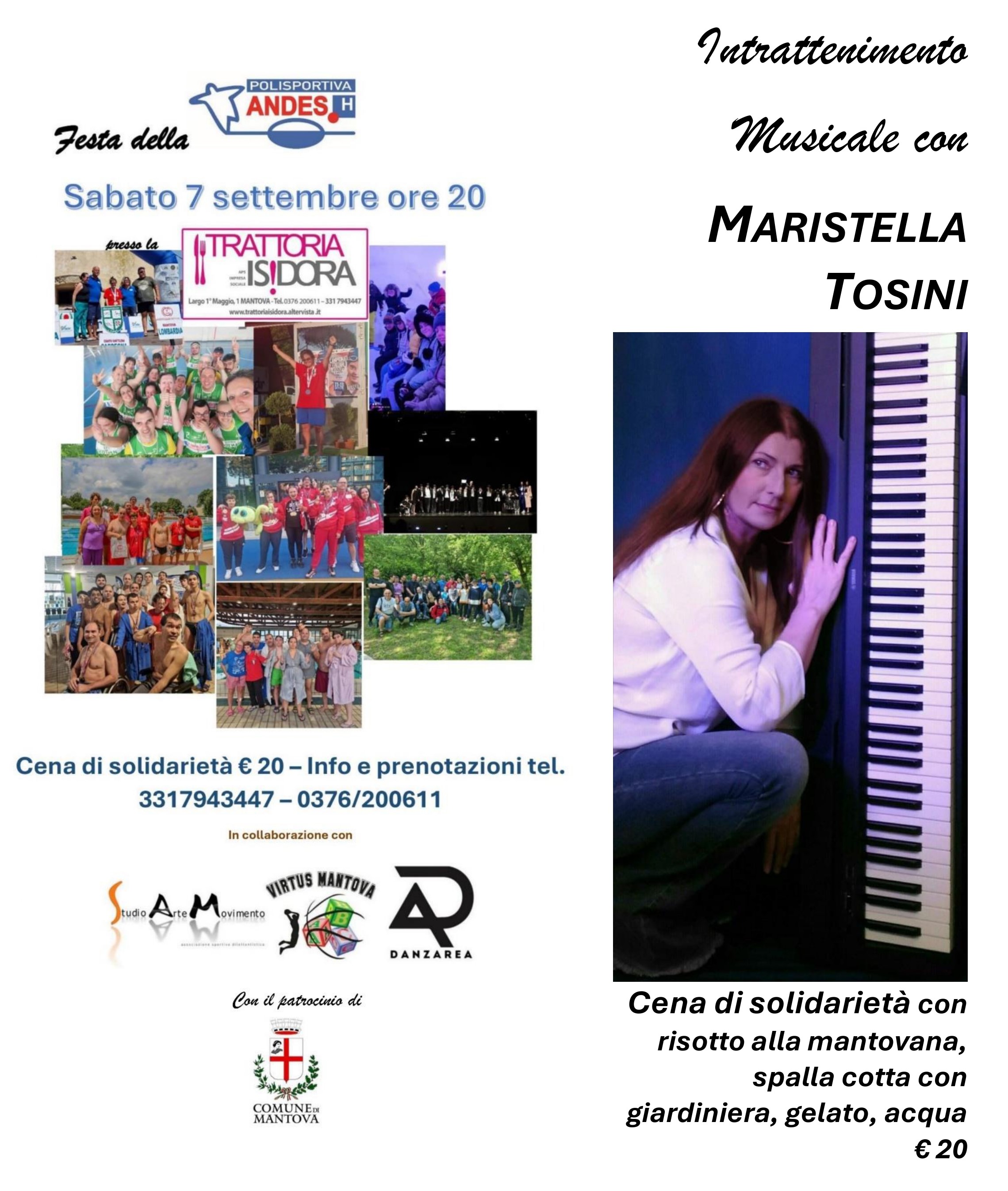 MANTOVA – Sabato 7 settembre a partire dalle ore 20, presso la Trattoria Isidora di Largo Primo Maggio 1 a Mantova, si terrà la consueta festa della Polisportiva Andes H con cena di solidarietà per raccogliere fondi a favore dei progetti di inclusione sportiva organizzati dal sodalizio e buona musica in compagnia di Maristella Tosini.