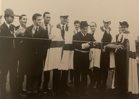 Ecco quel che accadde. Nel 1963 il nuovo ponte di Borgoforte era pronto, ma l’inaugurazione ufficiale veniva continuamente rimandata. Un gruppo di giovani dell’UGM., stanchi dell’attesa, decise allora di organizzarne una finta, in perfetto spirito goliardico. In una domenica di novembre, una ventina di ragazzi partì per Borgoforte nella nebbia padana con feluche, mantelli e un nastro tricolore. Rodolfo Signorini, scelto come “autorità” della cerimonia, indossò un elegante cappello scuro, l’abito nero e una fascia tricolore, assumendo il ruolo di sindaco improvvisato. Arrivati sul ponte, tesero un nastro tricolore e Signorini lo tagliò ufficialmente, tra gli applausi divertiti di passanti e curiosi. Seguì un ironico “collaudo” del ponte e, in piazza, l’immancabile “discorso ufficiale”, che fece ridere tutti. Il gruppo rientrò a Mantova come una piccola parata festosa, e l’episodio diventò presto una delle pagine più celebri della goliardia mantovana, ma anche due pagine di giornale: la Gazzetta di Mantova e Il Resto del Carlino, allora con redazione in città, dedicarono infatti due articoli alla scherzosa inaugurazione. Quella vera avvenne poi una decina di giorni dopo.