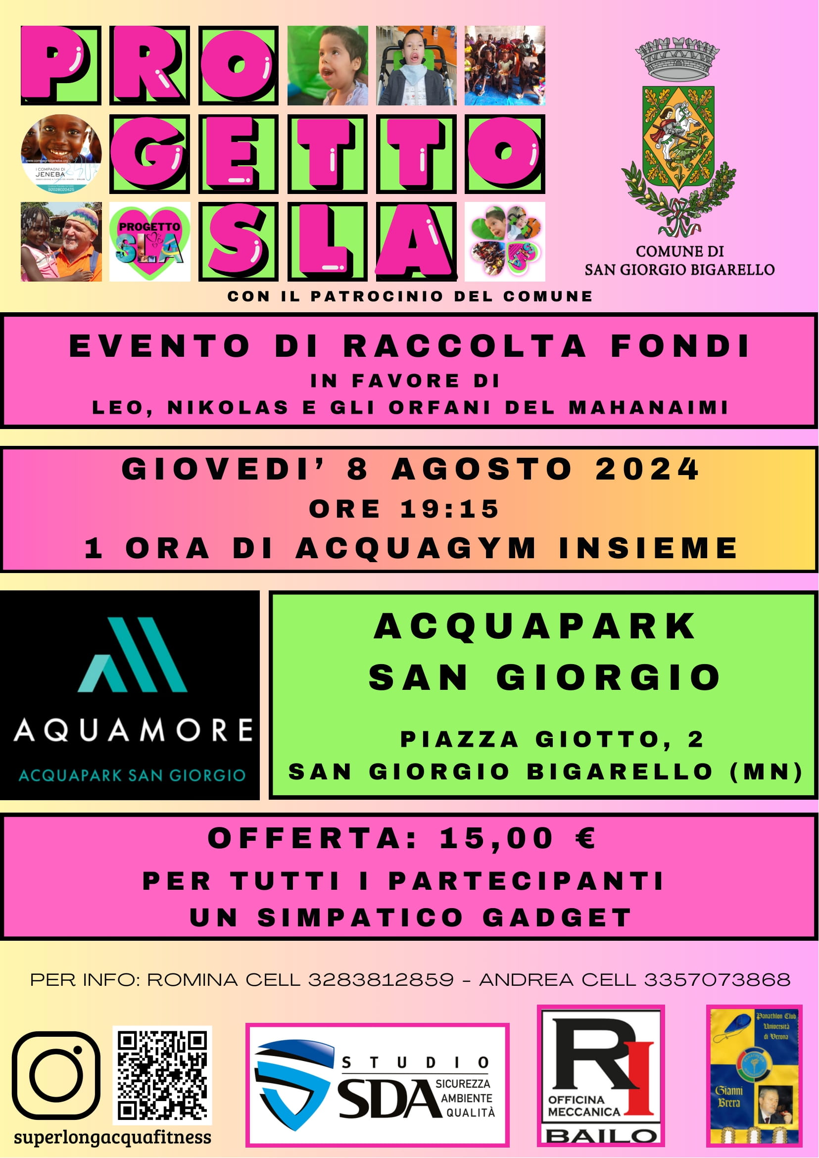 SAN GIORGIO BIGARELLO – Giovedì 8 agosto, grazie all’organizzazione dall’associazione “I Compagni di Jeneba” odv e con il patrocinio del Comune di San Giorgio Bigarello, si svolgerà l’evento benefico SLA – SuperLongAcquafitness, appuntamento inserito all’interno di una lunga serie di manifestazioni di raccolta fondi sul territorio mantovano e veronese che ha come protagonisti gli impianti natatori.