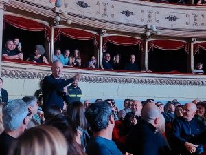 MANTOVA – Un’ora e mezza (abbondante) di un racconto che non è monologo perché sul palco Linus interagisce con Matteo Curti, sua spalla da tanti anni in radio, e con il pubblico stesso, in un continuo interscambio di impressioni e sollecitazioni. Dopo alcuni mesi di stop, il tour di Radio Linetti è ripartito ieri sera dal Teatro Sociale di Mantova, non esaurito ma senz’altro gremito da un pubblico numeroso, proveniente anche dalle città vicine.