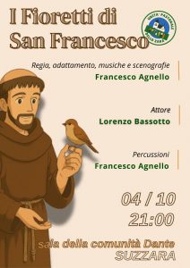 SUZZARA – In occasione della ricorrenza di San Francesco d’Assisi, patrono d’Italia, l’Unità Pastorale dello Zara propone un appuntamento teatrale di grande intensità spirituale e culturale. Sabato 4 ottobre, alle ore 21, presso la Sala della Comunità Dante, andrà in scena lo spettacolo “I Fioretti di San Francesco”, diretto dal regista Francesco Agnello.