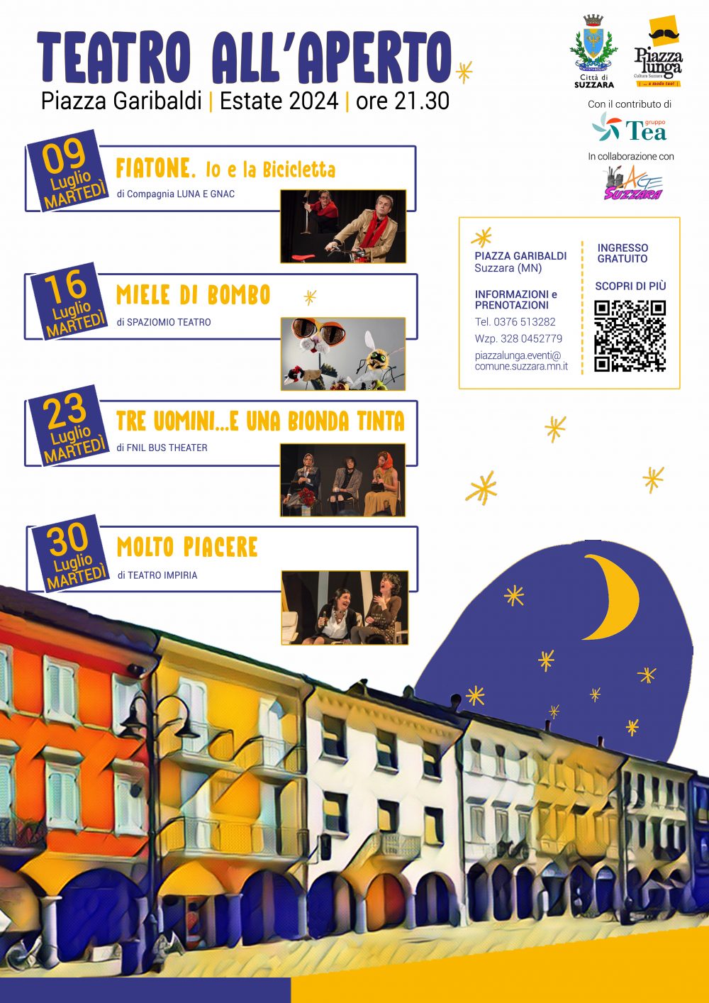 SUZZARA – Anche quest’estate ritorna l’apprezzato appuntamento con il “Teatro all’aperto” organizzato dal Comune di Suzzara e dal Centro Culturale Piazzalunga, con il contributo del Gruppo Tea e in collaborazione con Age Suzzara. Sarà la centrale piazza Garibaldi a trasformarsi nell’arena teatrale estiva, a meno che il meteo avverso ci metta lo zampino, e in tal caso gli spettacoli si terranno ugualmente ma presso la Sala della Comunità Dante in via Dante 1.