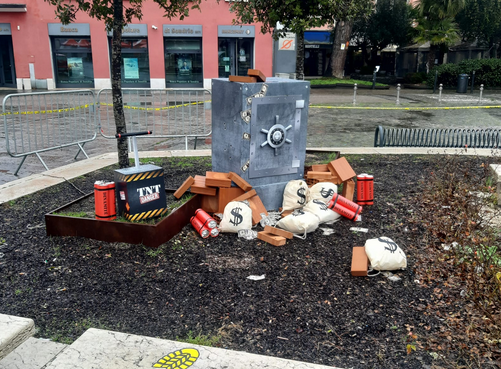 In piazza Garibaldi, nelle aiuole, è stata ricreata la scena di un assalto a una cassaforte: mattoni sparsi, sacchi di denaro e dettagli che richiamano un colpo andato storto. Poco distante, un fantoccio‑cadavere giace a terra, circondato dal nastro giallo‑nero in perfetto stile CSI.