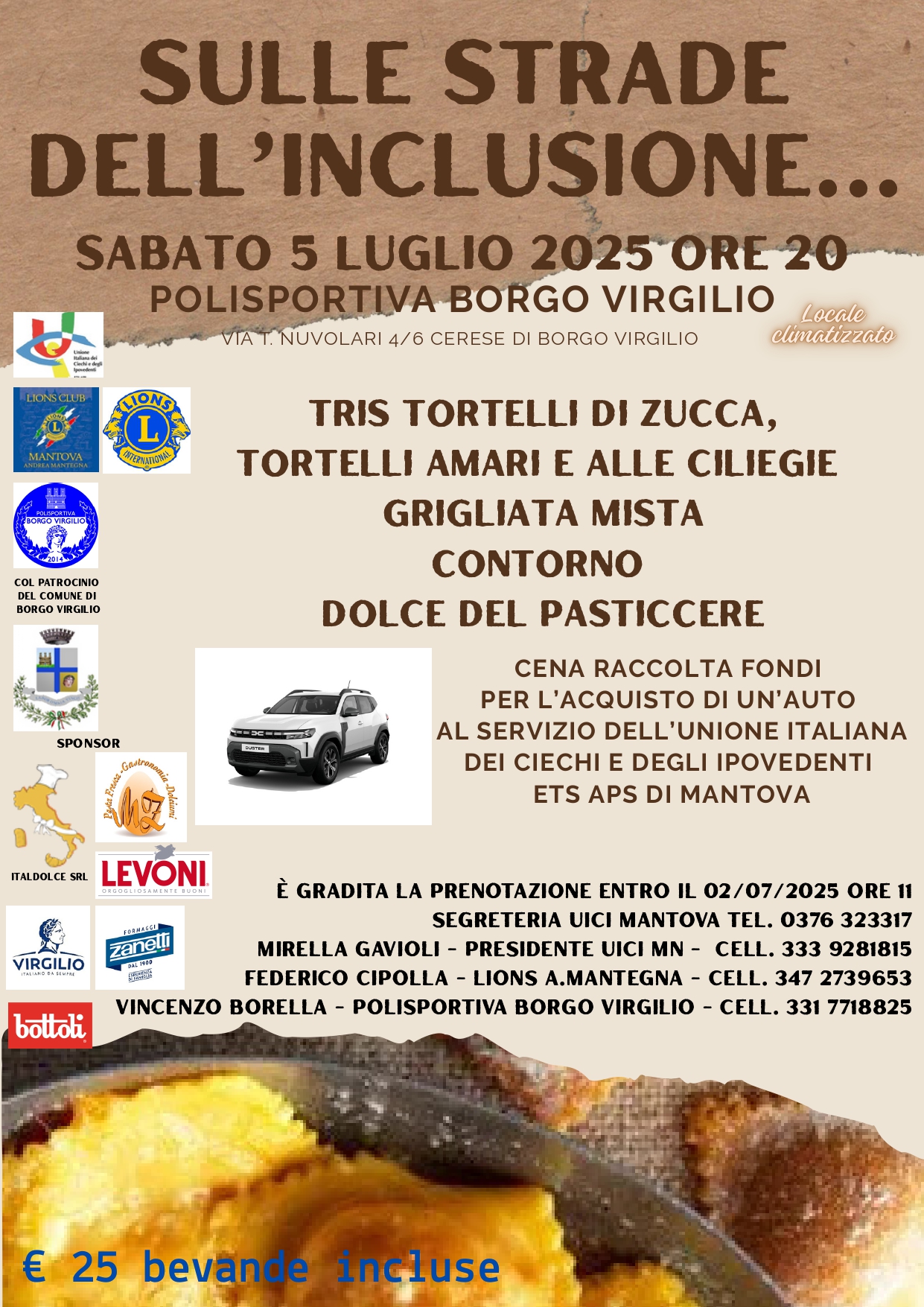 MANTOVA – Un tris di tortelli zucca, amari, alle ciliegie (ma non solo) per regalare una nuova auto all’UICI di Mantova. Una serata all’insegna della condivisione, della buona tavola condita da una ricca dose di generosità: sono questi gli ingredienti della cena solidale promossa dall’Unione italiana ciechi e ipovedenti di Mantova: è l’appuntamento organizzato per il 5 luglio alle 20 alla Polisportiva Borgo Virgilio (a Cerese di Borgo Virgilio (MN), in via Nuvolari 4/6).