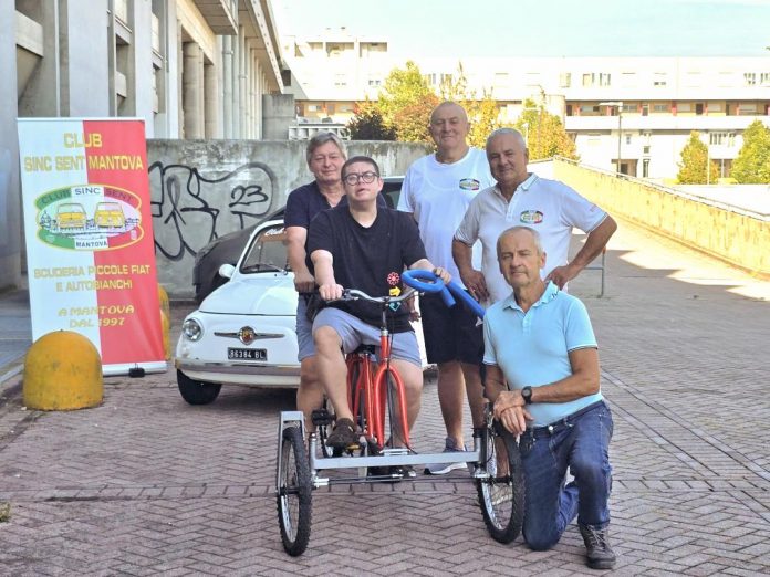 A commissionare le biciclette è il Club Sinc Sent, fondato nel 1997, noto per l’organizzazione di raduni annuali di Fiat 500 storiche e altri veicoli d’epoca. Il più seguito è quello che ogni giugno parte da Piazza Sordello, attraversando paesi e città del territorio mantovano. L’edizione 2025 ha visto la partecipazione di 230 vetture, e come da tradizione, il ricavato delle quote d’iscrizione, al netto delle spese, è stato destinato all’acquisto di una bicicletta progettata in base alle esigenze del beneficiario.
