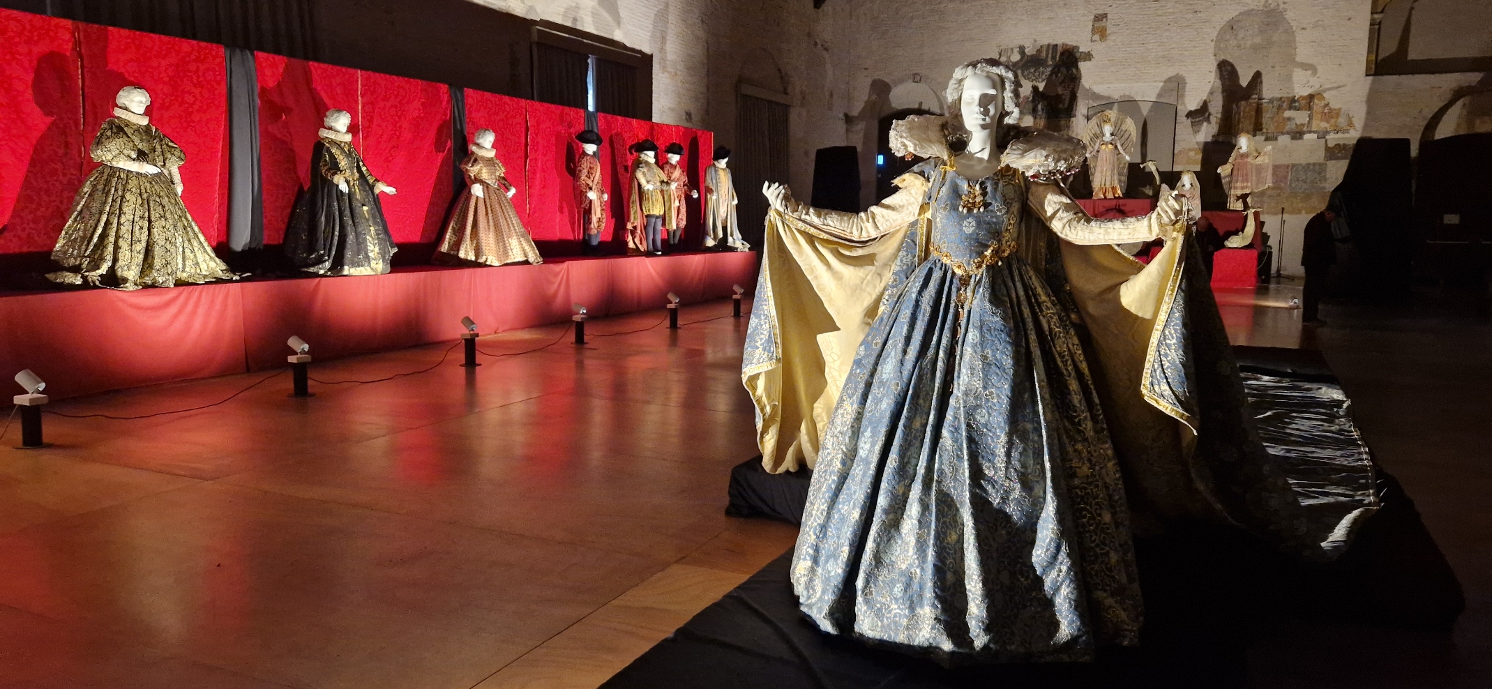 Nel centro del salone è allestito l’abito di una regina/imperatrice a corte, con uno strascico di 9 metri di lunghezza per 5 di larghezza (la coda dell’abito lunga rappresenta l’importanza del personaggio e della cerimonia);