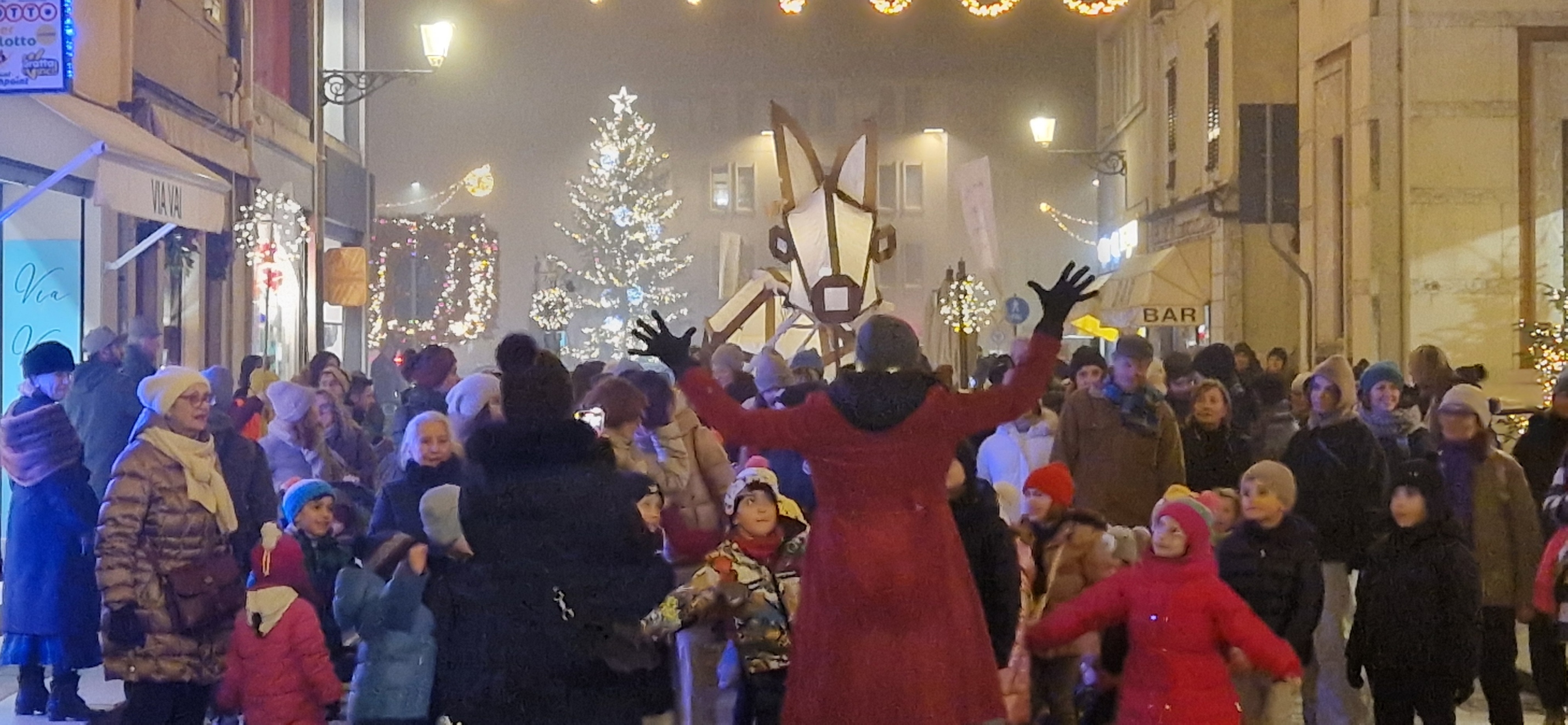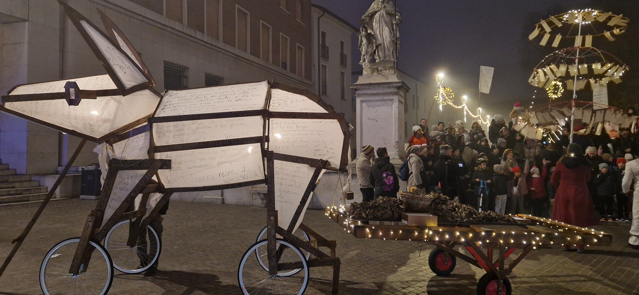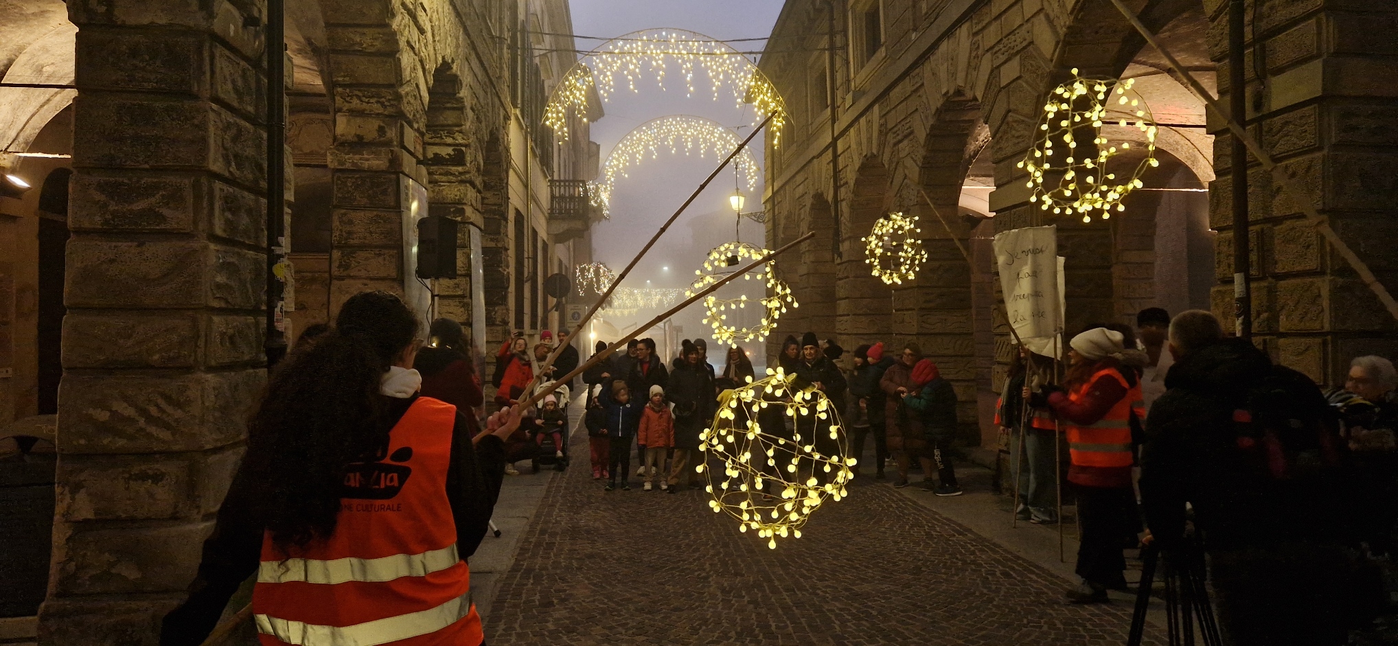 MANTOVA – Luci natalizie, messaggi di pace e una passeggiata attraverso il centro di Mantova per accogliere l’arrivo di Santa Lucia. È andato in scena anche quest’anno il tradizionale appuntamento “Aspettando Santa Lucia”, organizzato da Segni d’Infanzia, che ha portato con sé un messaggio di speranza e di pace per grandi e piccini. In piazza Martiri, un grande asino di legno con un carretto luminoso, simbolo di pace, ha attirato l’attenzione, mentre sul Lungorio cartelloni con frasi che invitano alla riflessione accoglievano i partecipanti.