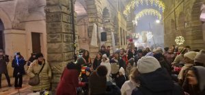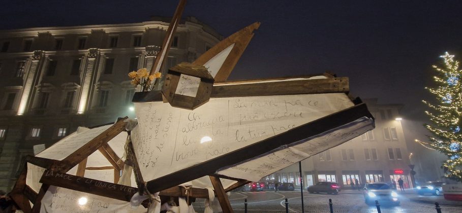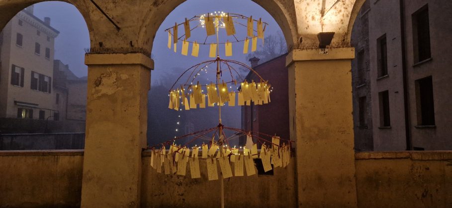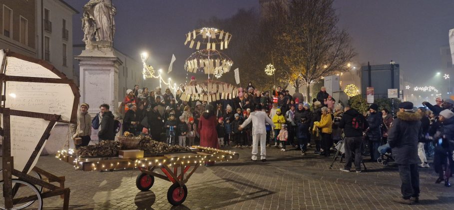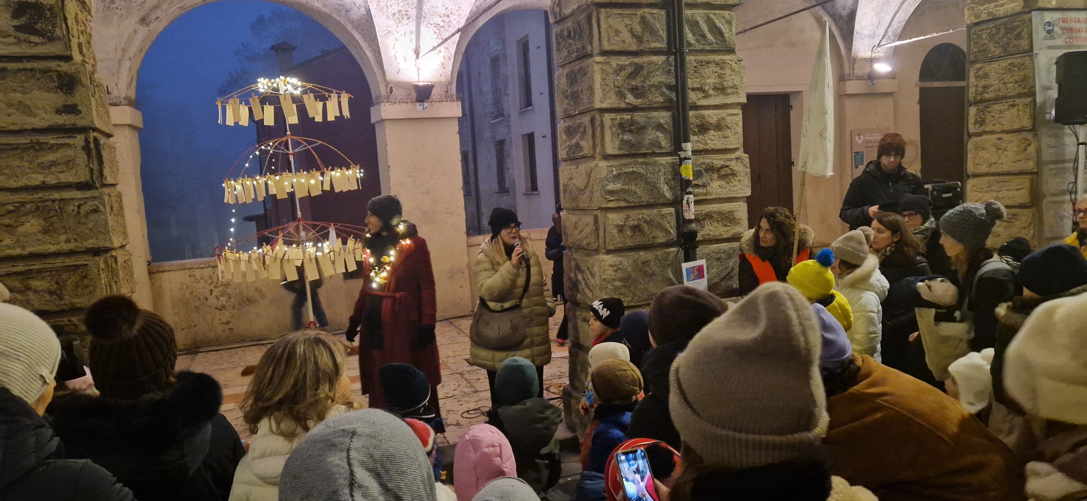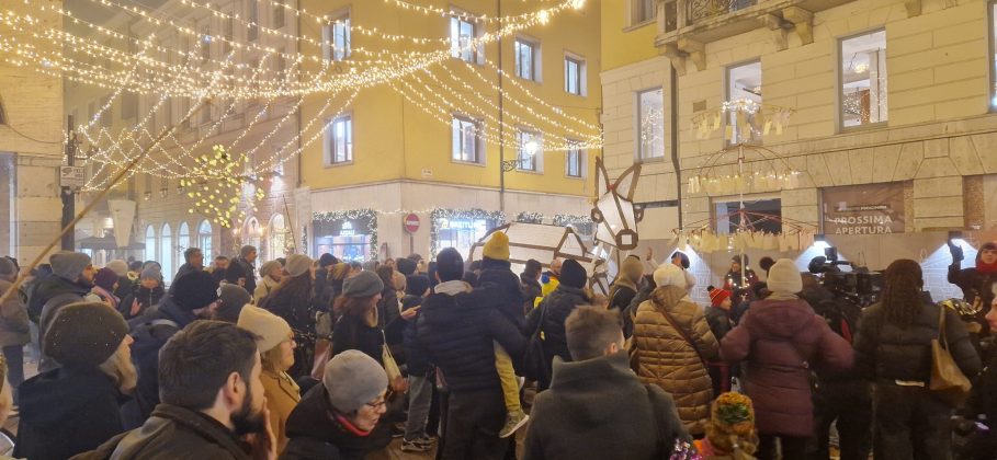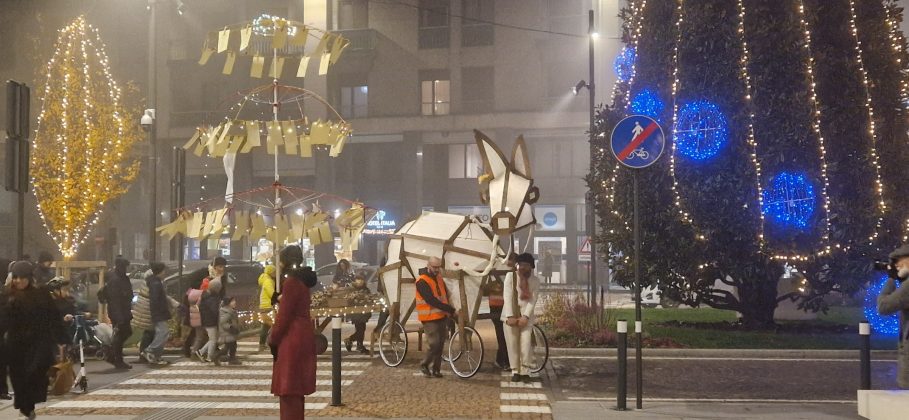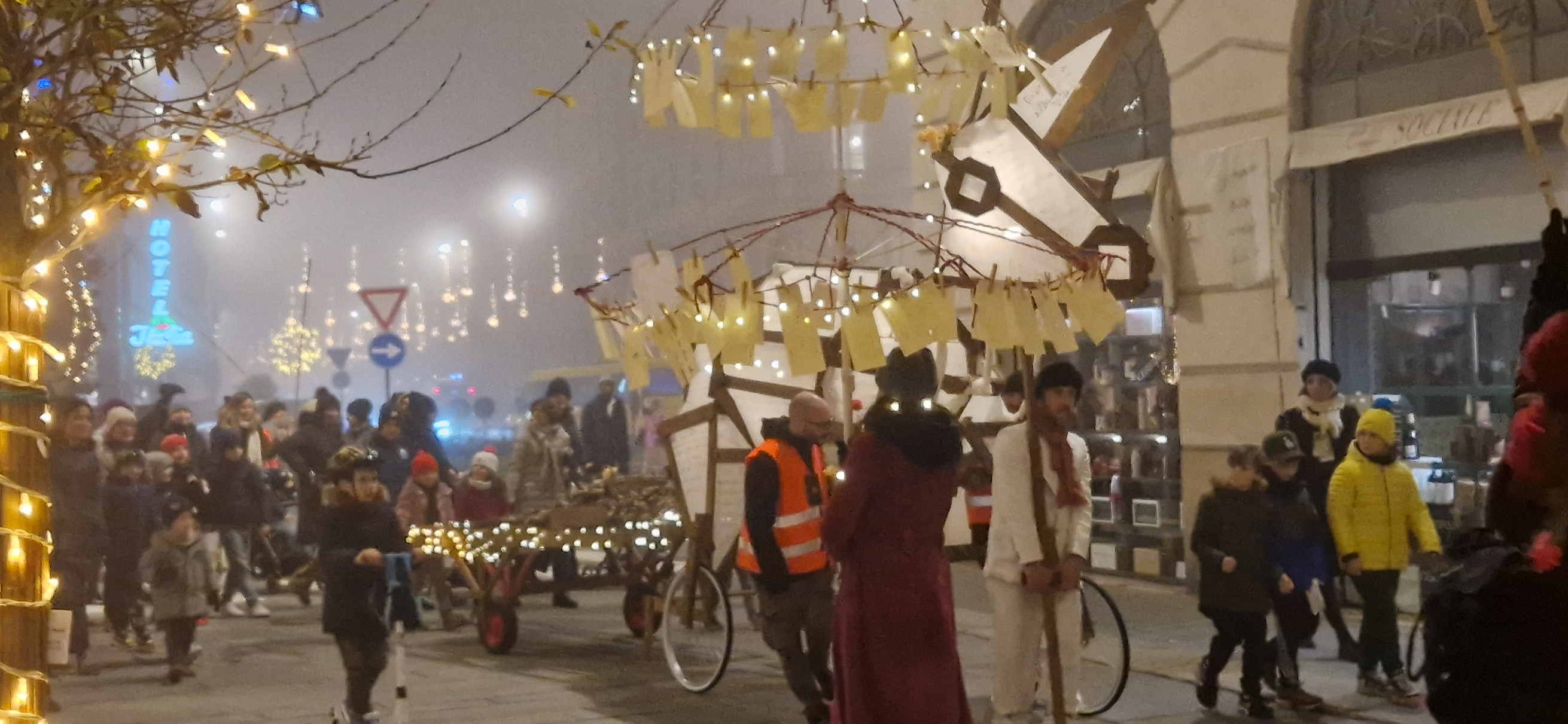 MANTOVA – Luci natalizie, messaggi di pace e una passeggiata attraverso il centro di Mantova per accogliere l’arrivo di Santa Lucia. È andato in scena anche quest’anno il tradizionale appuntamento “Aspettando Santa Lucia”, organizzato da Segni d’Infanzia, che ha portato con sé un messaggio di speranza e di pace per grandi e piccini. In piazza Martiri, un grande asino di legno con un carretto luminoso, simbolo di pace, ha attirato l’attenzione, mentre sul Lungorio cartelloni con frasi che invitano alla riflessione accoglievano i partecipanti.