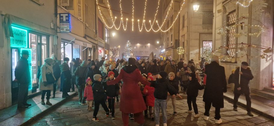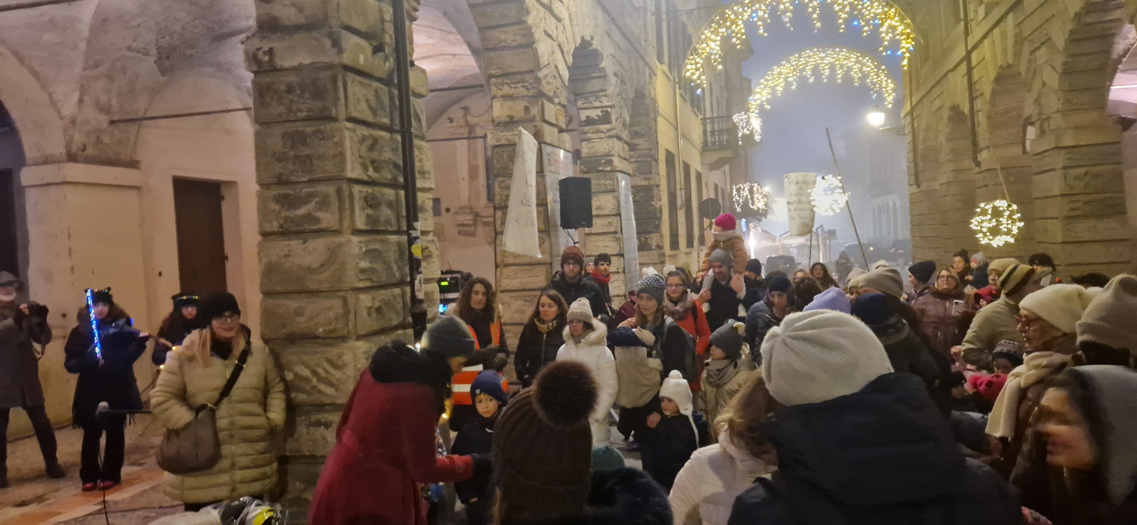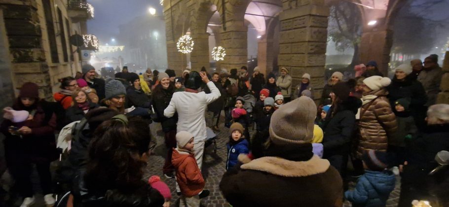 L’atmosfera suggestiva, resa ancora più magica dalla nebbia che avvolgeva la città, amplificando la bellezza dei momenti di gioco e delle risate dei bambini ovattando rumori e luci. Durante la passeggiata, il pubblico è stato coinvolto in un gioco: alla ricerca di tre oggetti magici disseminati lungo il percorso.
