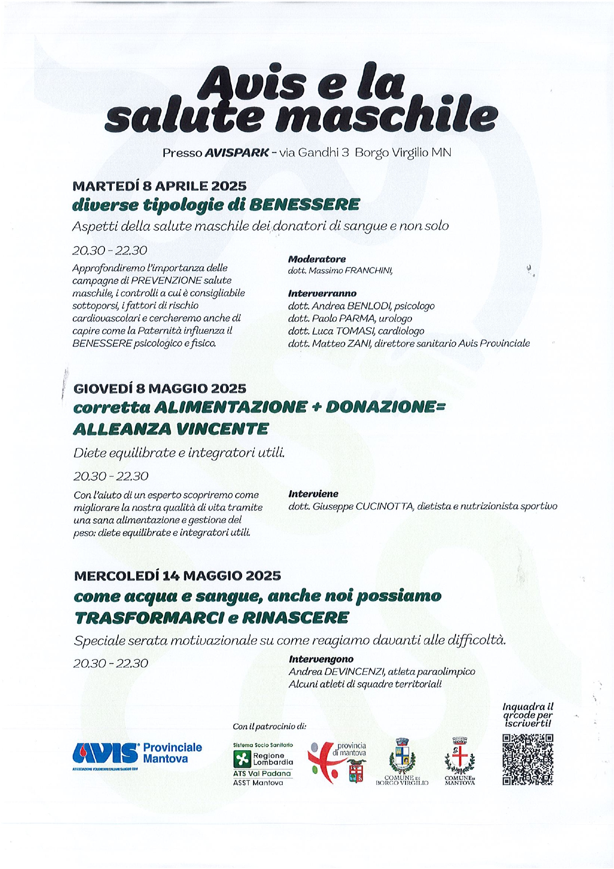“Con questo nuovo ciclo d’incontri – spiega Maura Scapi, coordinatrice del progetto – prosegue l’impegno di Avis Provinciale Mantova a favore dell’informazione a carattere sanitario, individuata come priorità dall’art. 2 del nostro statuto. Lo scorso anno si è tenuto quindi un primo ciclo di conferenze dal titolo “Avis dona prevenzione”, pensato in particolare per l’universo femminile che ha visto diversi medici specialisti affrontare argomenti a carattere sanitario, parlando di prevenzione e medicina di genere, di prevenzione psicologica, del delicato tema della violenza contro le donne. L’attenzione ai bisogni della collettività è un aspetto che caratterizza la nostra associazione e il suo agire, pertanto la salute è argomento che riteniamo vada affrontato e sviluppato quanto più possibile, a beneficio di tutti. Quest’anno si è deciso di proporre un ciclo di incontri dal titolo “Avis e la salute maschile”, con focus sulla prevenzione e sul benessere psicofisico”.